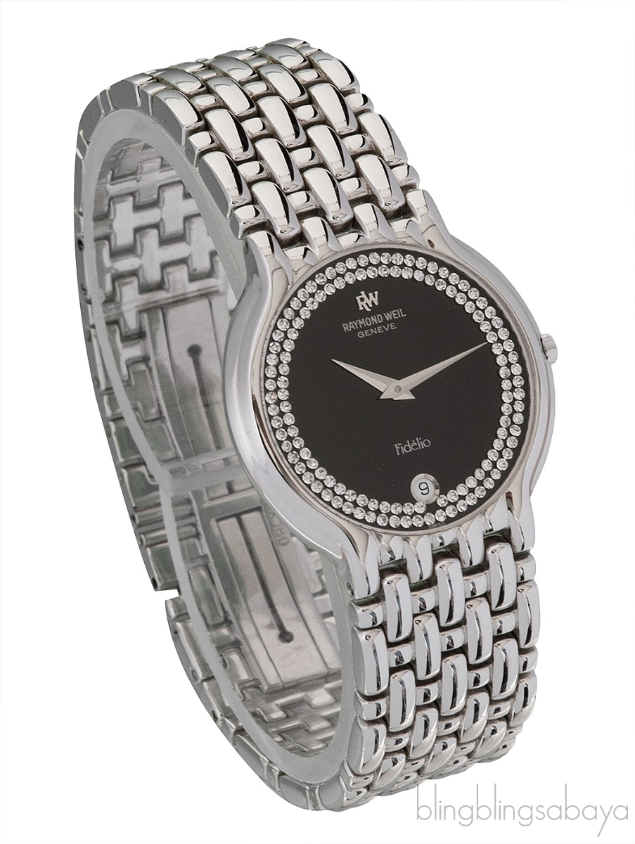 This Fidelio 4802 White Gold Plated Diamond Watch from Raymond Weil features a 34 mm round case in 18ct white gold electroplated. This watch features a black dial with two rows of diamonds, date set at 600 o'clock, and chain bracelet.