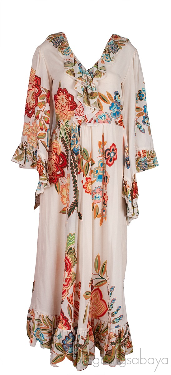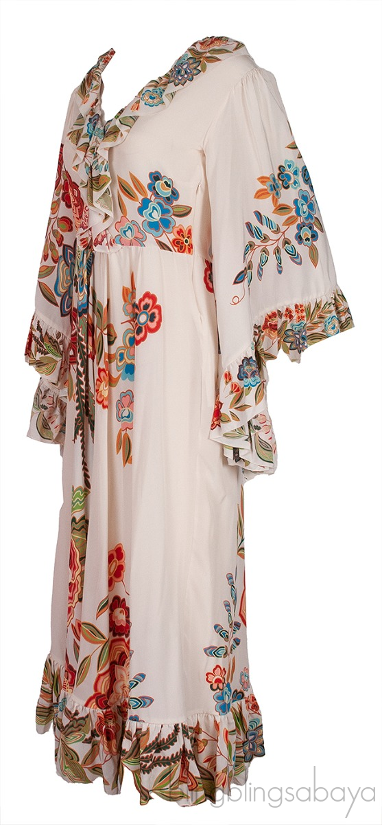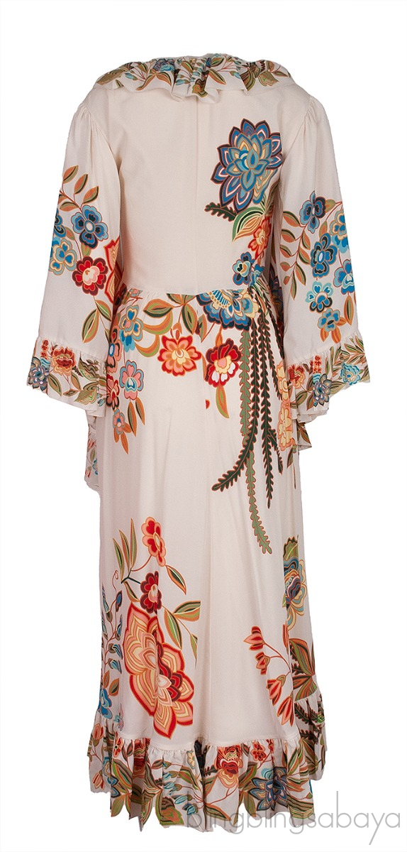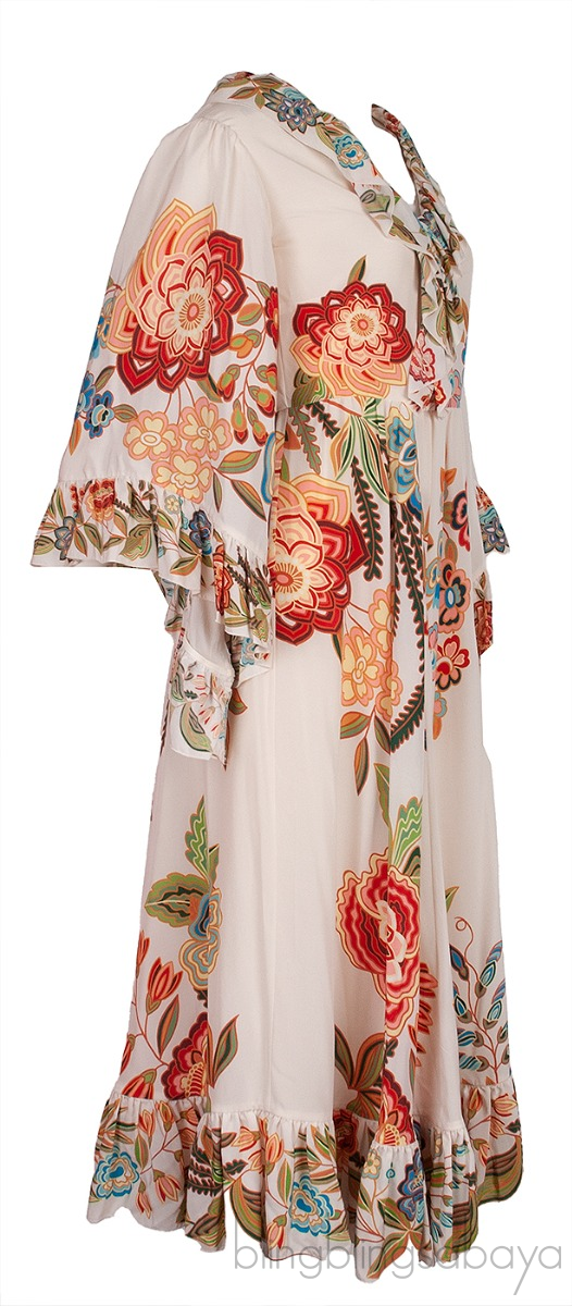 This Flared Wide Sleeves Ruffle Trim Maxi Dress from Etro is crafted in off-white floral print fabric. This dress features v-neckline, flared sleeves, maxi length, side zip fastening and ruffle trim.