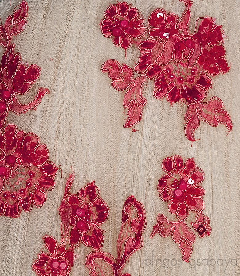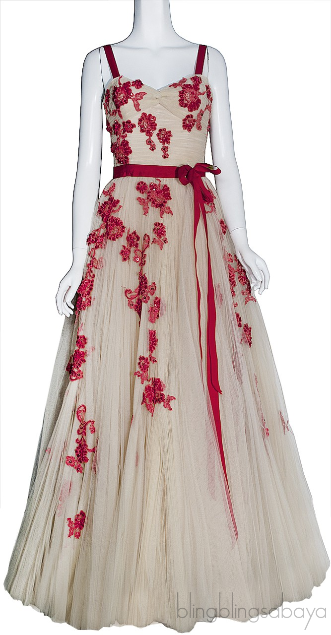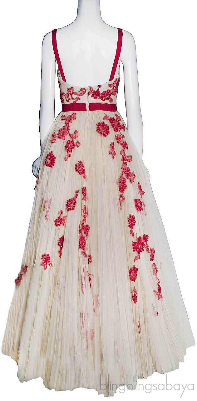 This stunning Floral Applique Nude Gown from Zuhair Murad features a sweatheart neckline with interlock fabric and horizontal pleats design on the front, red shoulder straps that matches the self tie ribbon at waist, A-line skirt with a floor length hem, concealed zip and hook fasteing at back and red floral applique beautifully embellished on some areas of the dress.