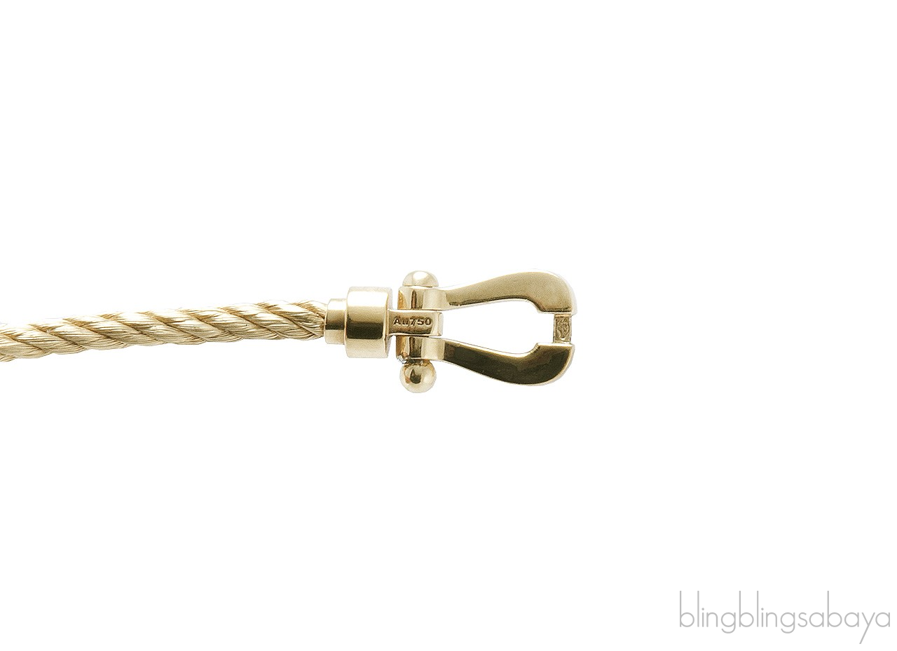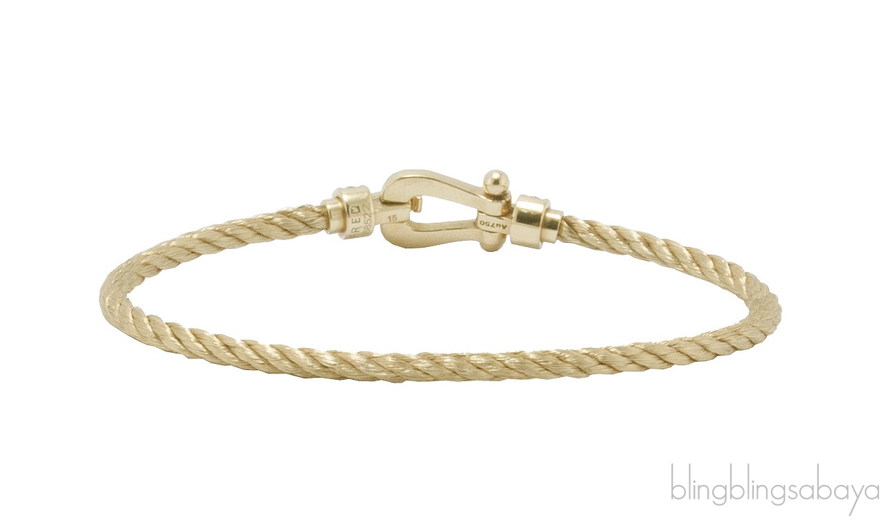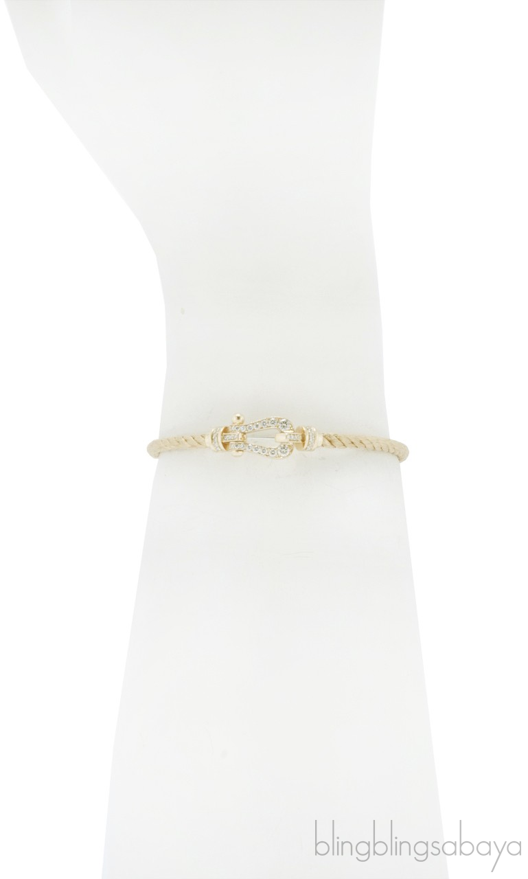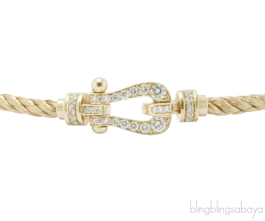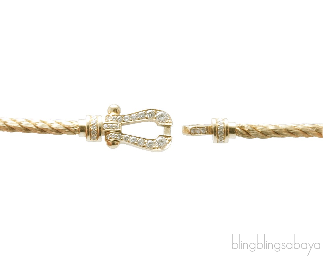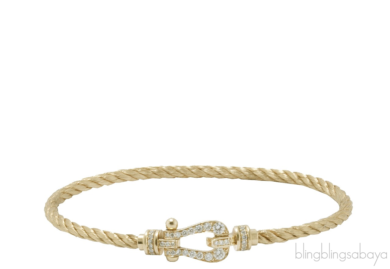 Inspired by a braided marine cable secured both ends to a buckle, given by Fred's eldest son to his wife as a present began the Fred's Force 10 Collection. This Force 10 Bracelet from Fred is crafted in Yellow Gold Plated cable and buckle pave with 0.32 carat / GVS 34 brilliant cut diamonds .