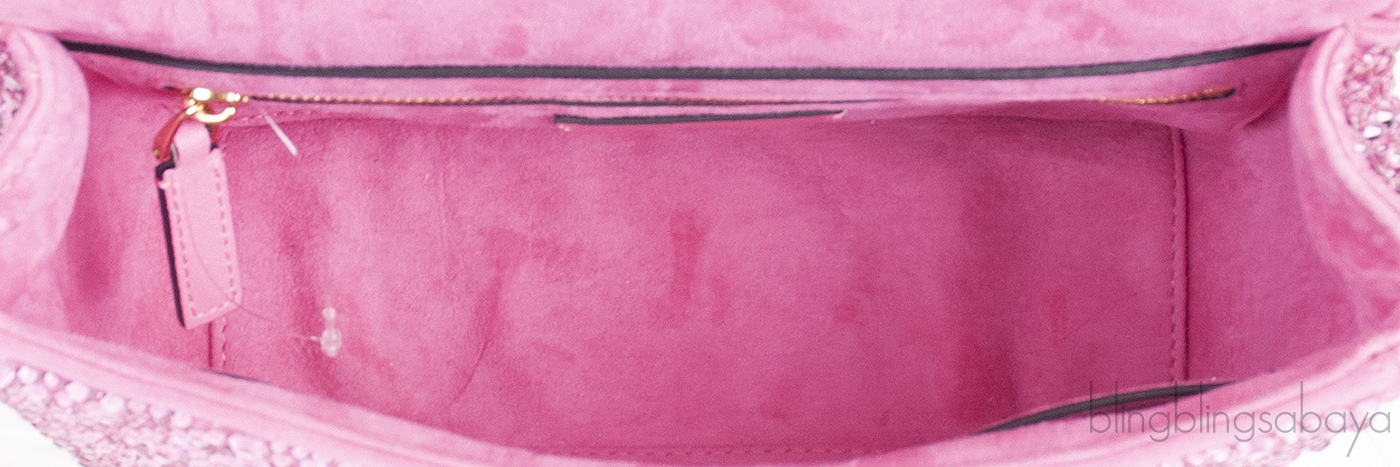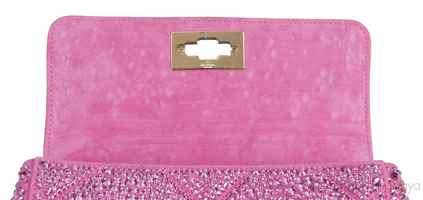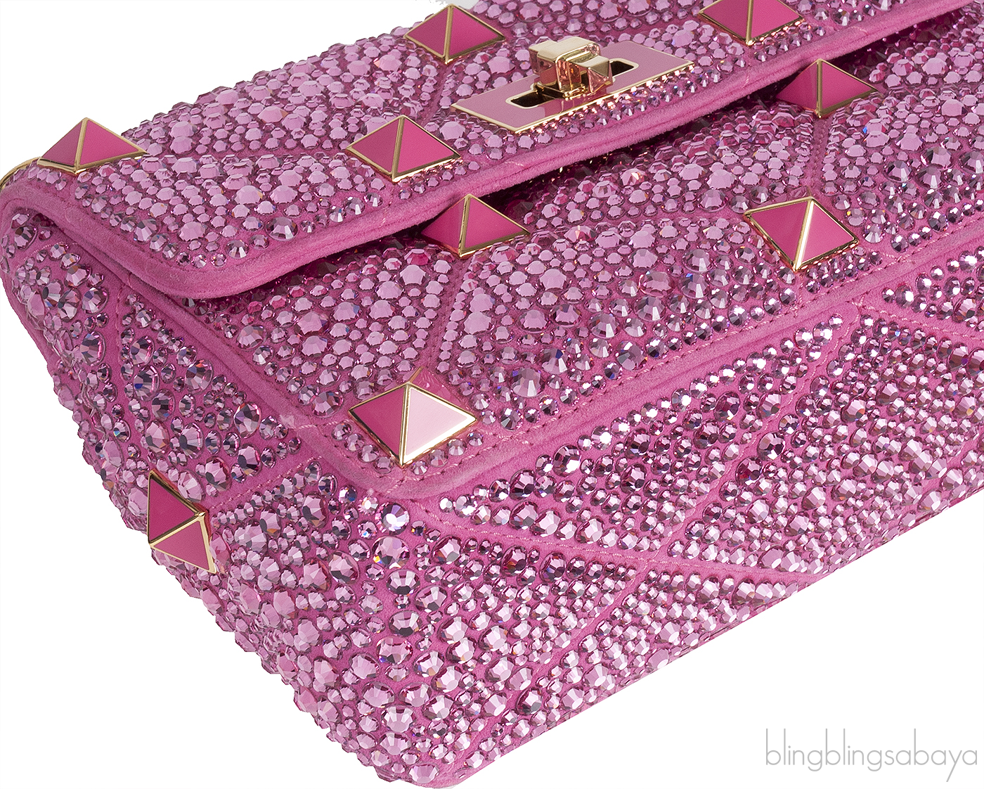 This shoulder bag features a shimmering crystal and pink studs embellishment, flap cover with turn-lock closure at front, detachable flat top leather handle and detachable gold chain shoulder strap. Interior is fully with coordinating leather and has one patch pocket and zip pocket inside.