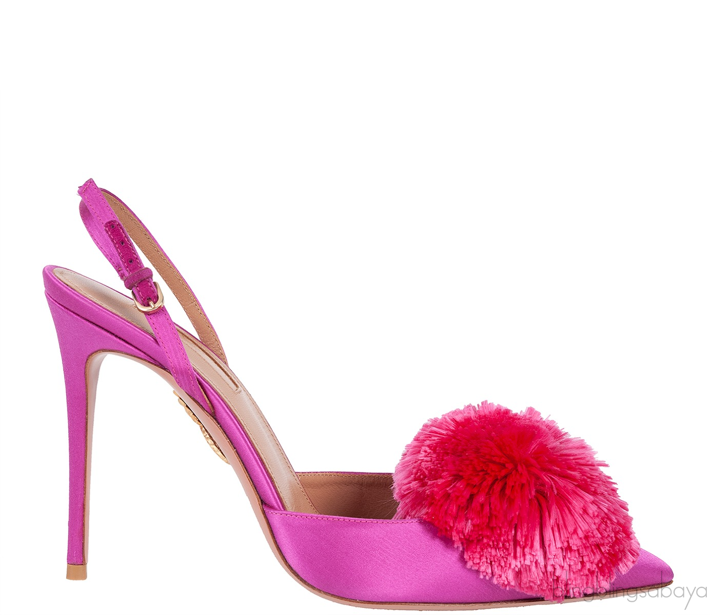 These Fuchsia Powder Puff Heels from Aquazzura are made of fuchsia satin upper with nude leather lining. This stunning sandal features a pointed toe with pompom detailing at the vamp, slingback with buckle fastening, leather lined insole and leather sole.