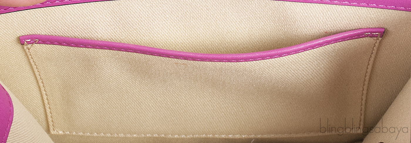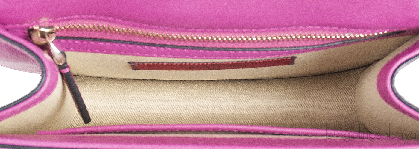 This stunning piece has a metal chain strap that can be styled single or double. Interior is fully lined with beige canvas and has one zip pocket and one patch pockets inside.