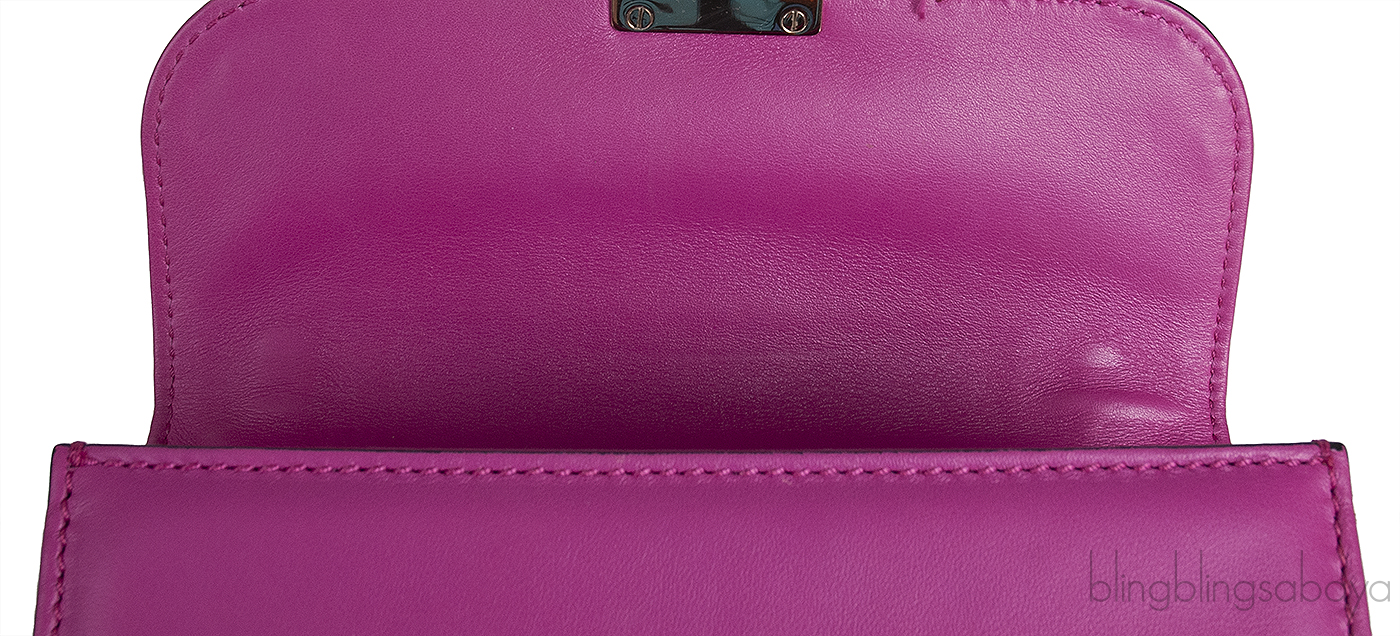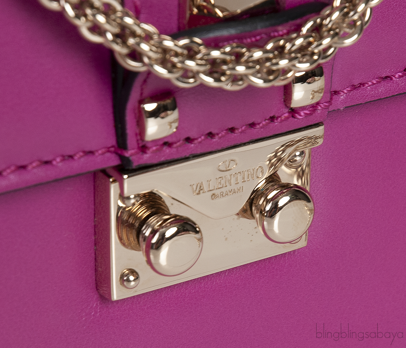 This Fuchsia Rockstud Glam Shoulder Bag from Valentino Garavani is expertly crafted fuchsia pink leather accented with gold metal details. This piece features a flap cover with tuc push lock closure with logo2 and iconic gold tone finishing macro studs.