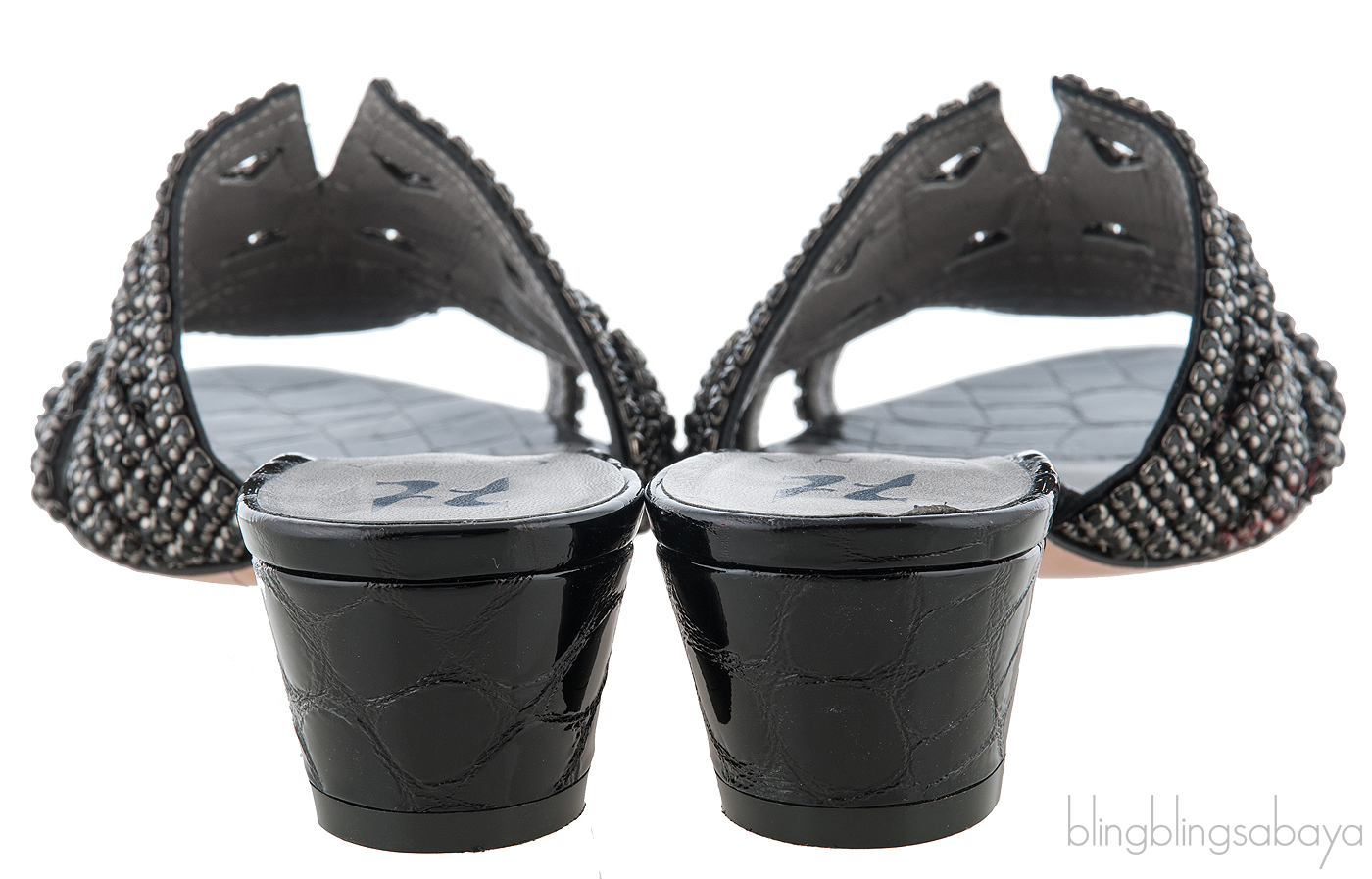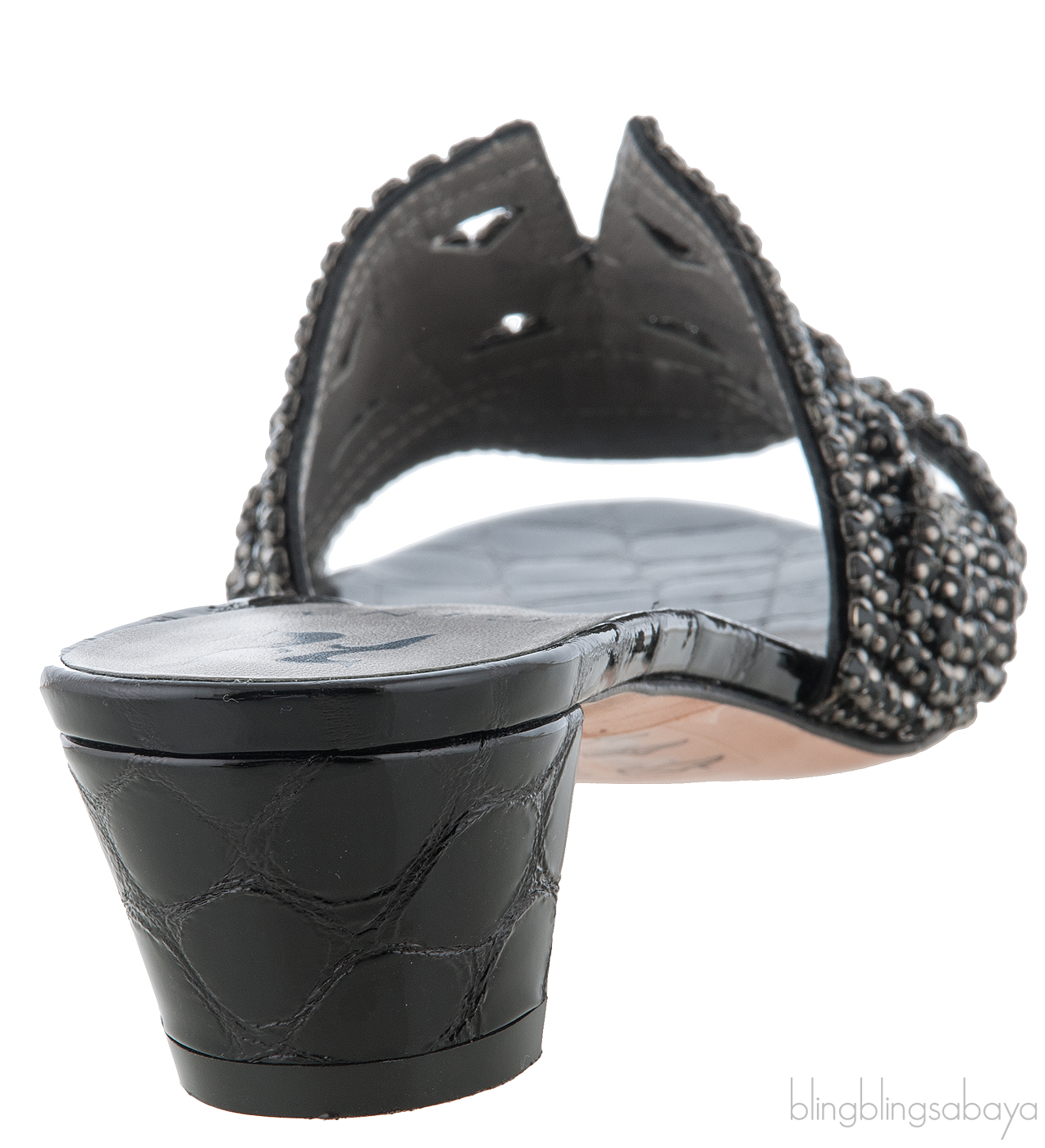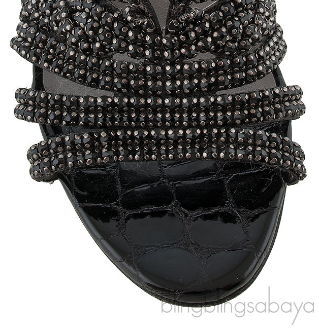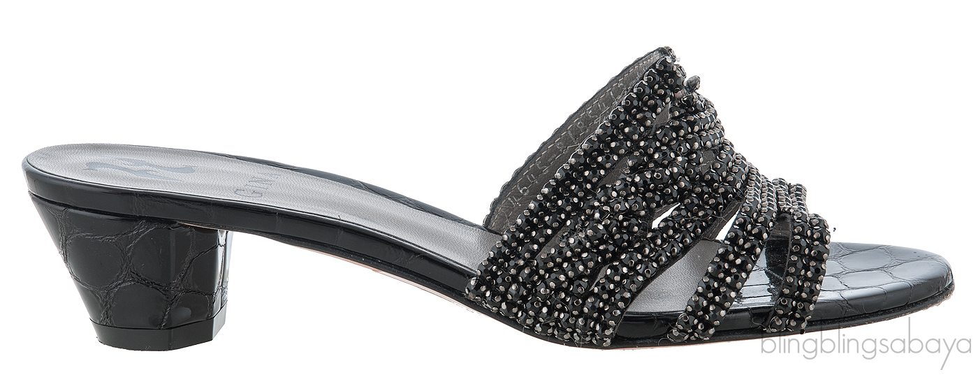 These Galaxy Croc Embossed Off-white Heeled Sandals from Gina are made of black leather upper decorated with sparkling black Swarovski crystals. These sandals features a leather lined insole, crocodile embossed leather trimming,leather covered heels measuring 50 mm high and leather lined sole.