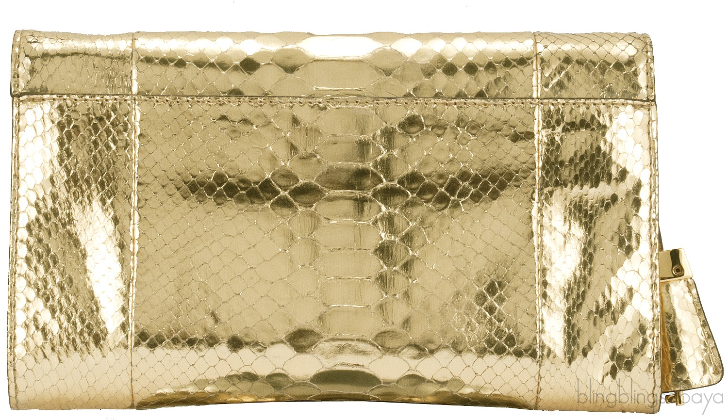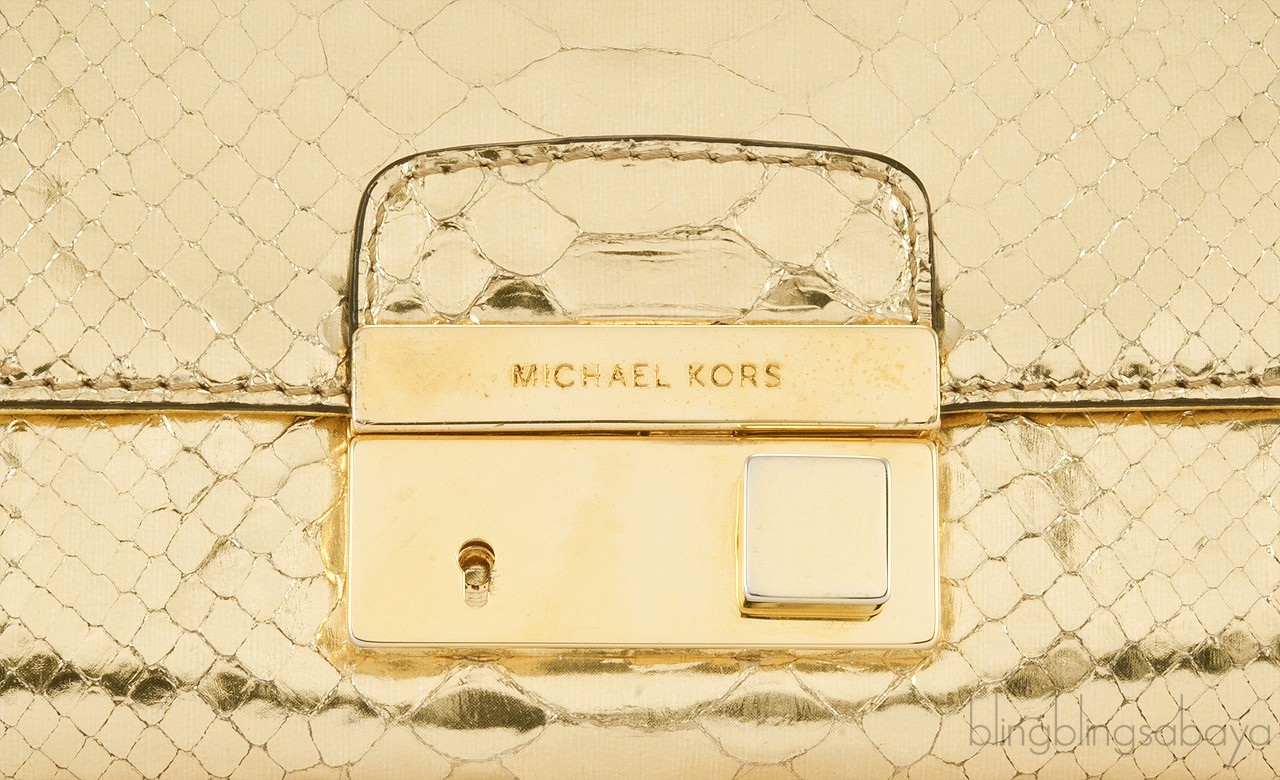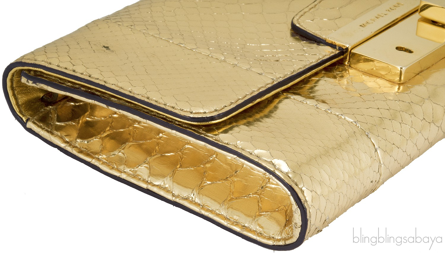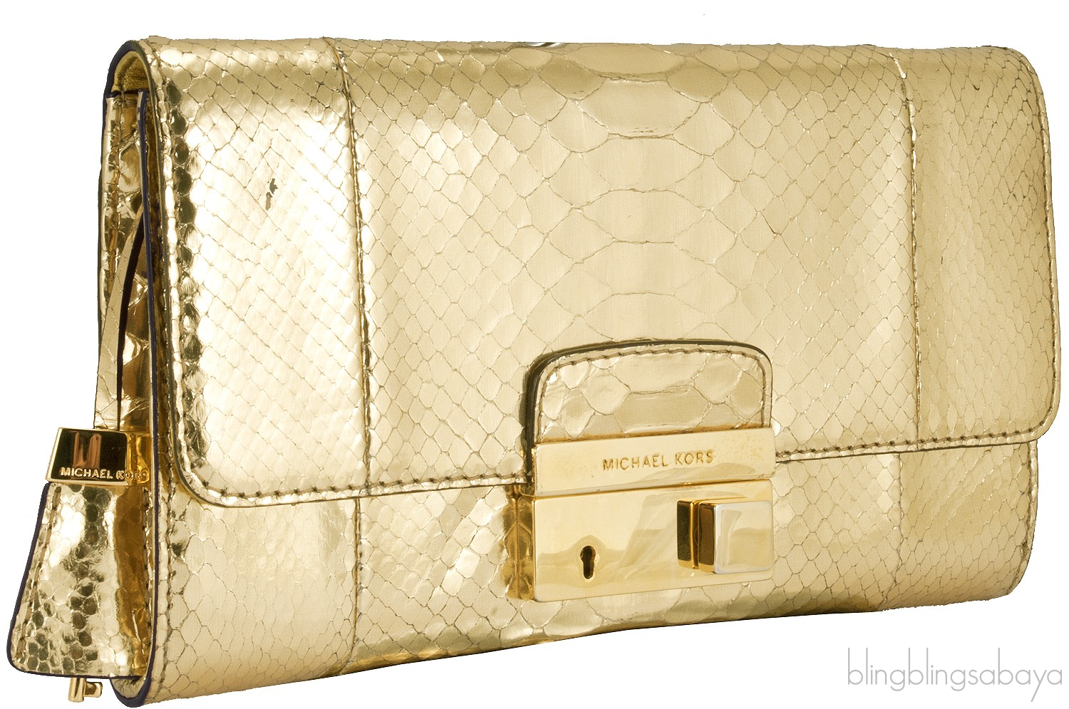 This Gia Gold Python Clutch from Michael Kors is crafted in exotic metallic gold Python Leather accented with the Golden Hardware. This stunning clutch features a flap covering with logo2-engraved magnetic lock closure with keys and logo2 engrave clochette. Interior of this clutch is fully lined with coordinating leather with one flat pocket inside. This clutch comes with optional python leather strap.