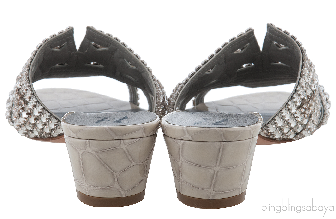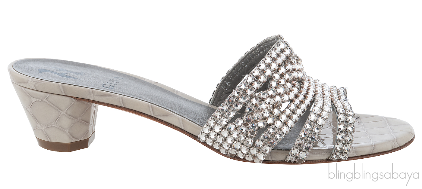 These Galaxy Croc Embossed Off-white Heeled Sandals from Gina are made of silver leather upper decorated with sparkling silver Swarovski crystals. These sandals features a leather lined insole, crocodile embossed leather trimming,leather covered heels measuring 50 mm high and leather lined sole.