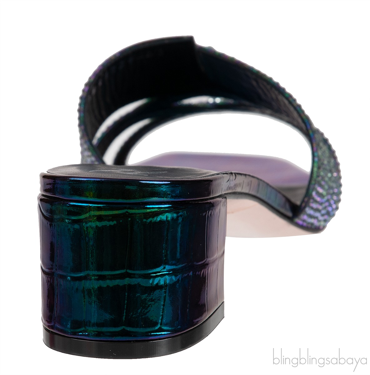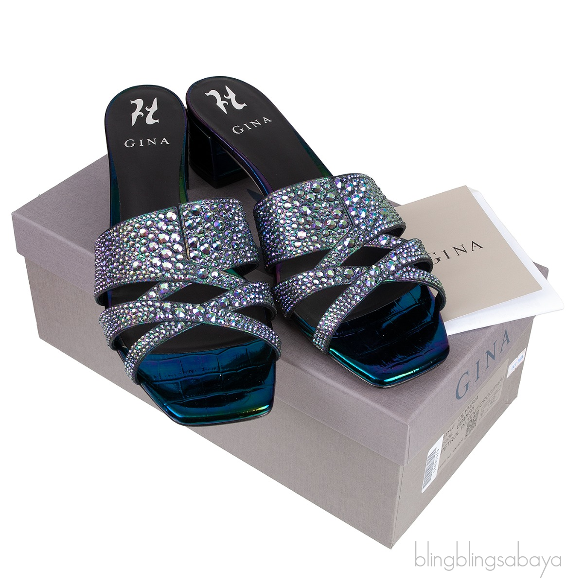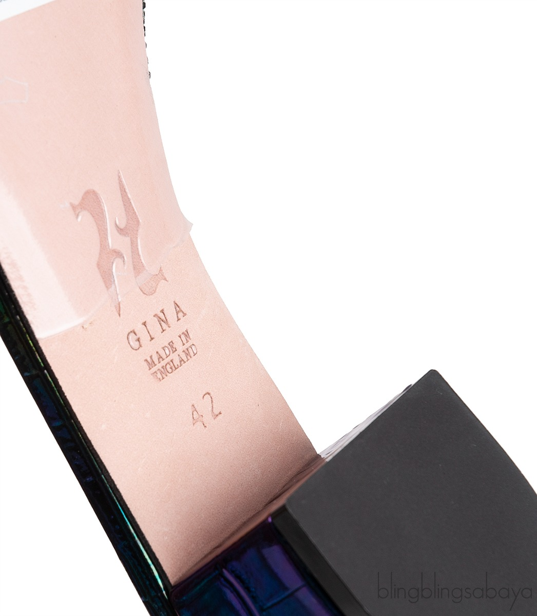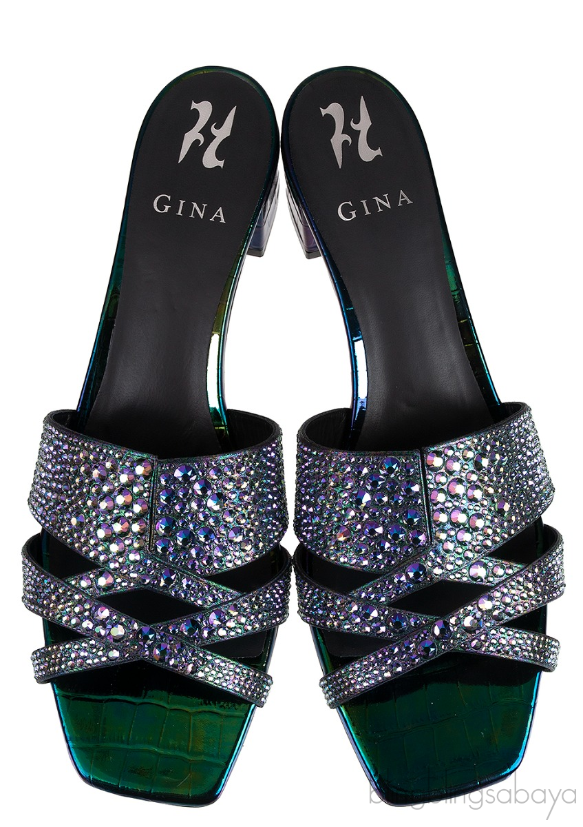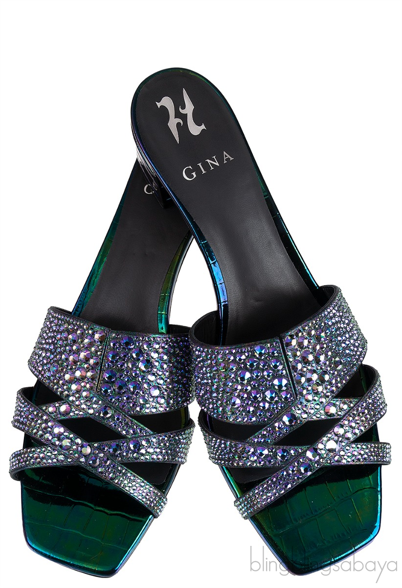 These Petrol Patent Croc Embossed Crystal Heeled Sandals from Gina are made of Multicolored metallic patent leather upper decorated with A criss-cross vamp, with signature ‘V’ cut, embellished with dazzling Swarovski crystals.