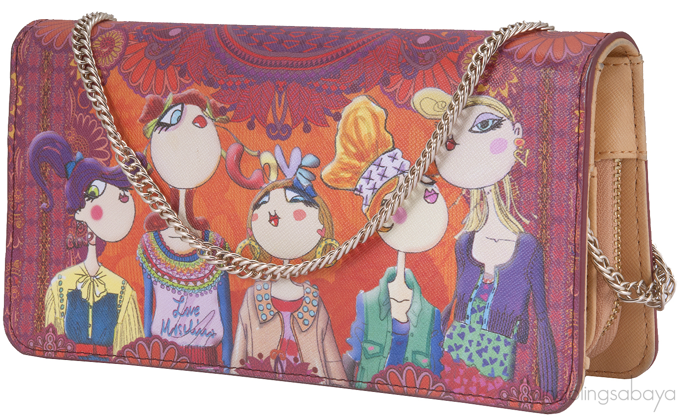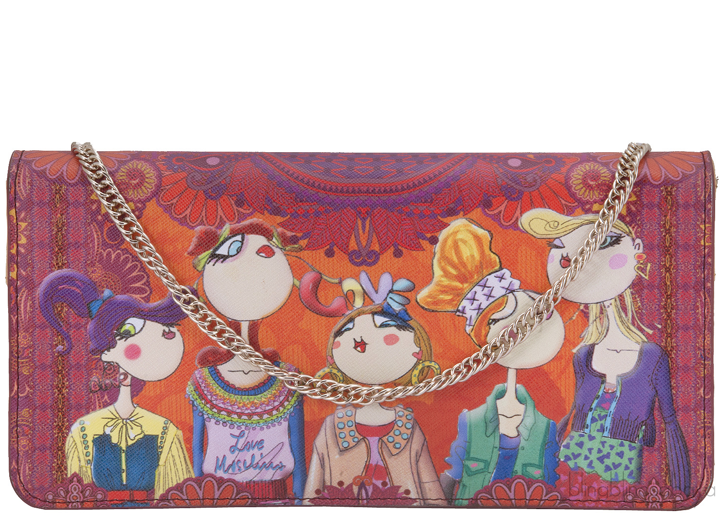 This super chic Girls Print Clutch Shoulder Bag from Love Moschino is crafted in Multi-color Printed Saffiano grained eco Leather accented with light gold hardware. This clutch shoulder bag features Girl Printing at front and comes with detachable short shoulder chain. Interior is fully lined with beige leather featuring two zip compartment, twelve credit card slots and two slit compartment for bills & receipt.
