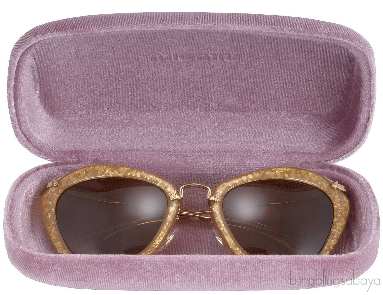 This fashionable sophisticated forties style inspired sunglasses from MIU MIU features a Pentagon acetate frames with a gold glitter finish. It has the gold lenses with antiqued gold metal hinges and stamped designer logo2 on the arm.