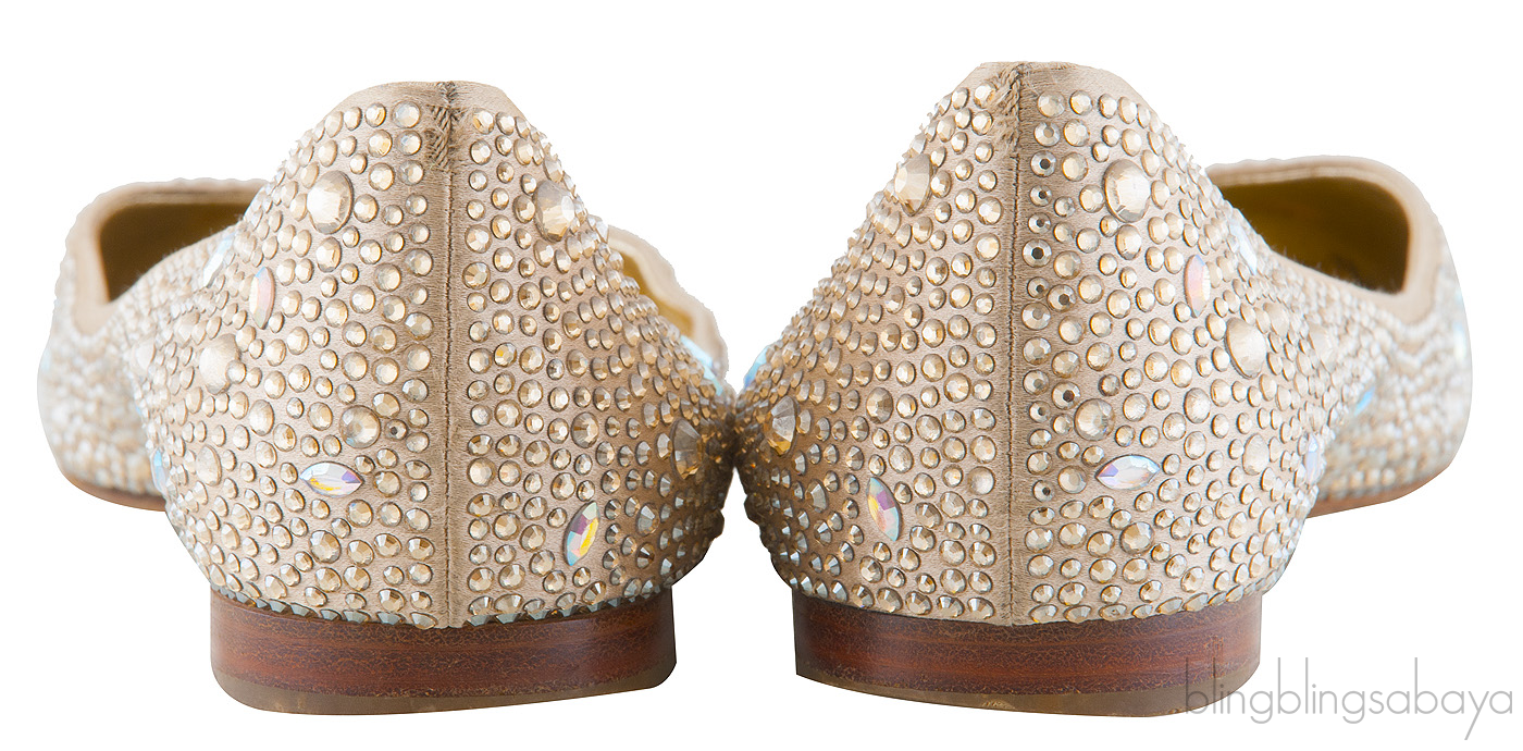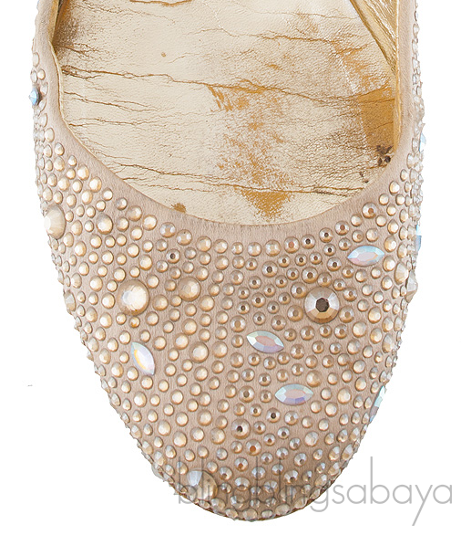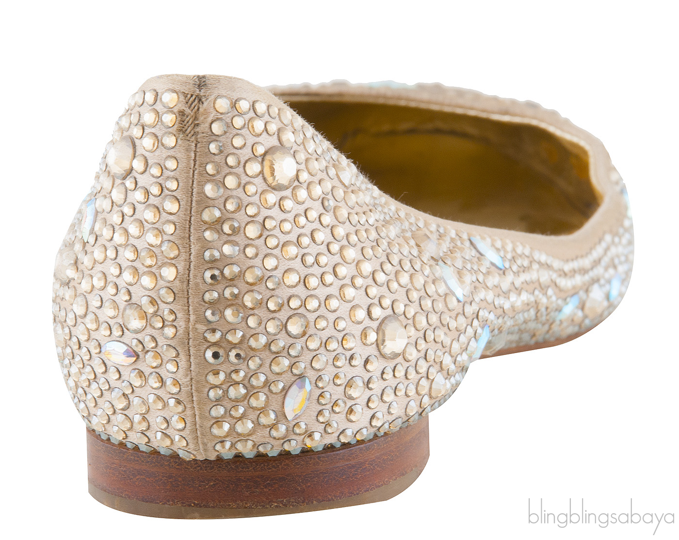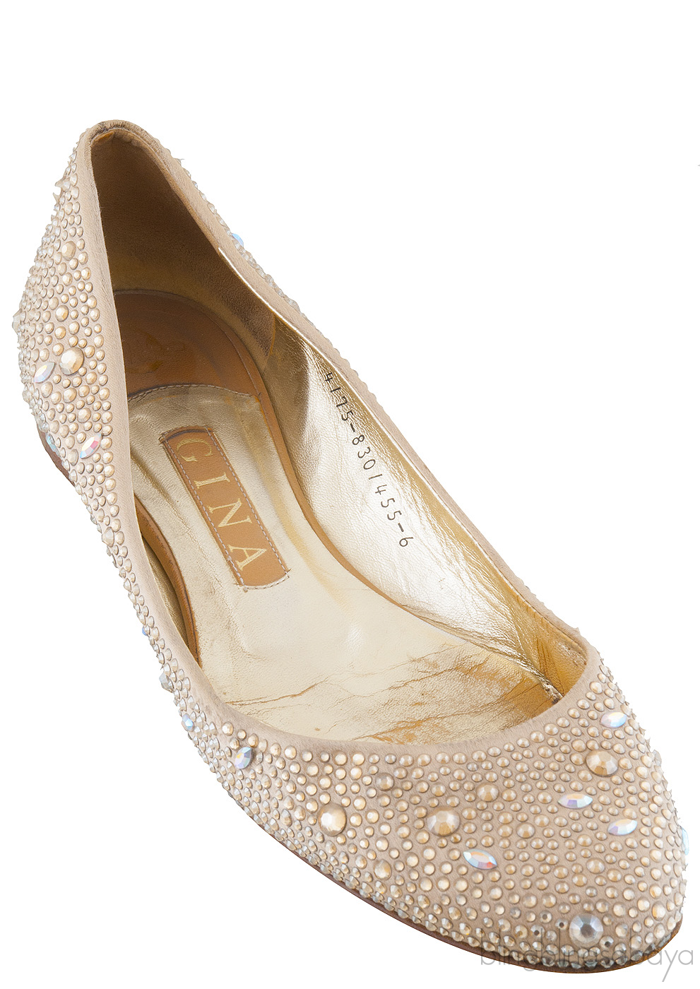 This dazzling Gold Crystal Ballet Flat from Gina is elegantly encrusted with swarovski crystal in a gold satin and fully lined with gold metallic leather, featuring a ballet flat design with round almond toe and leather sole.