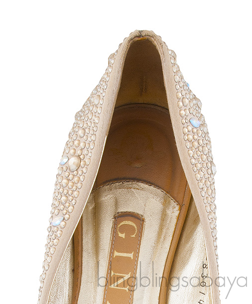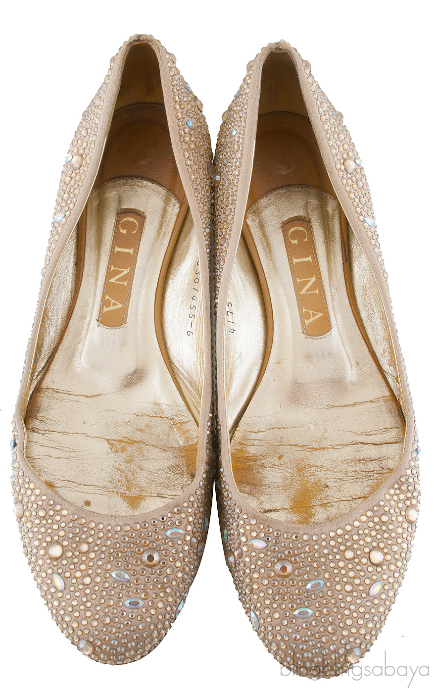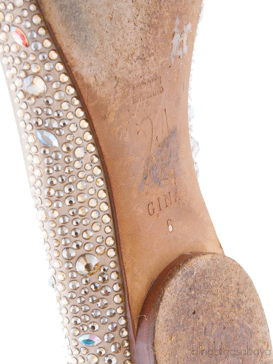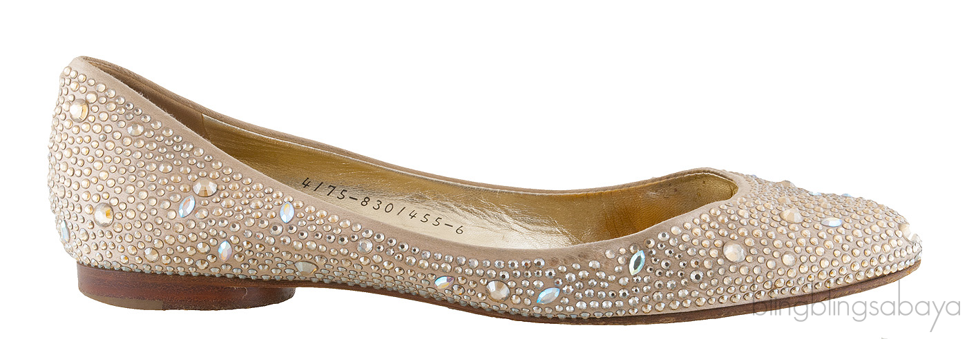 This dazzling Gold Crystal Ballet Flat from Gina is elegantly encrusted with swarovski crystal in a gold satin and fully lined with gold metallic leather, featuring a ballet flat design with round almond toe and leather sole.