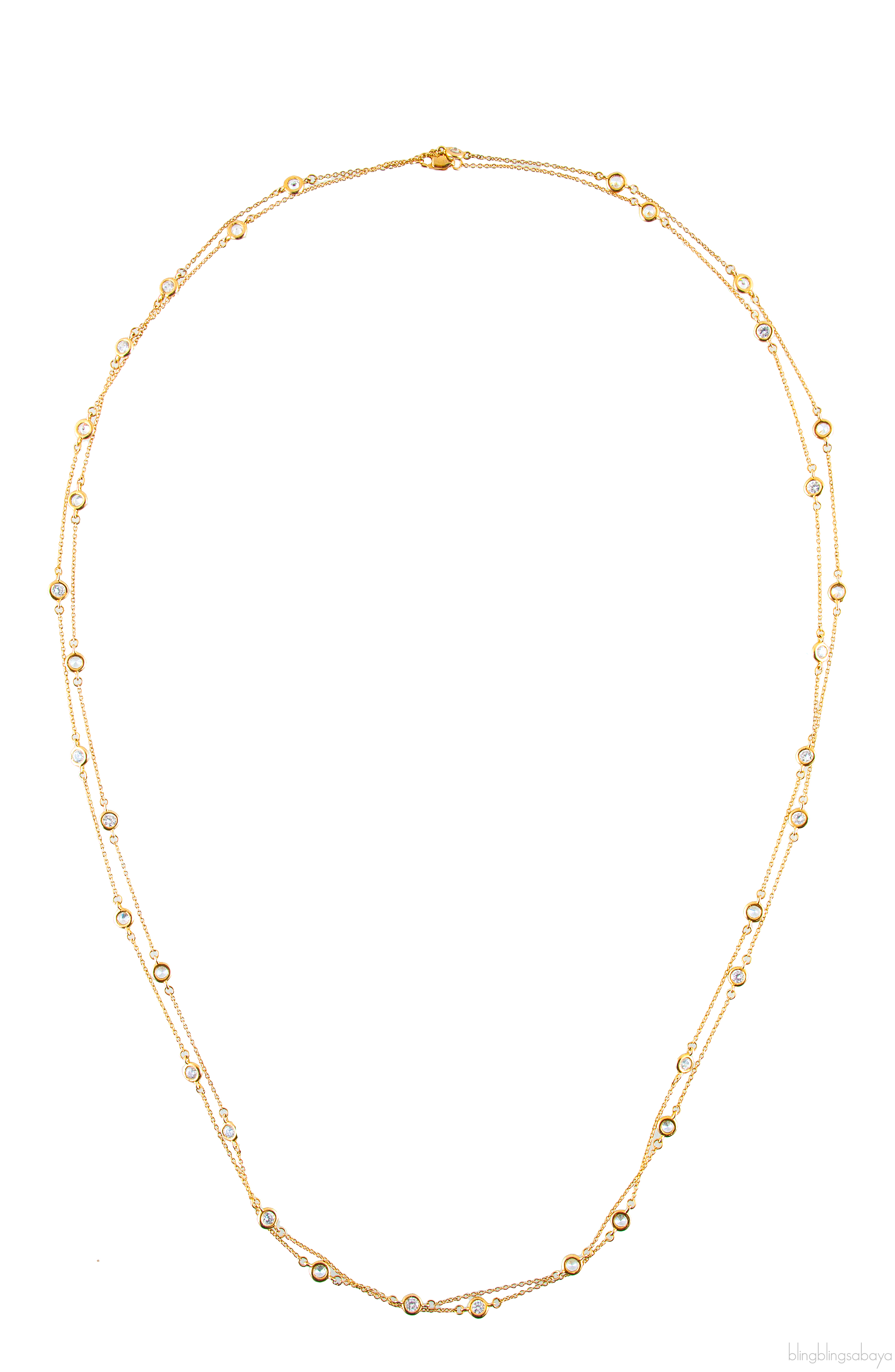 These set of Gold Diamond Necklace & Bracelet from Aqua Uae are made of 18ct yellow gold. This long necklace measures 136 cm long set with 35 pieces of diamonds and a gold clasp.