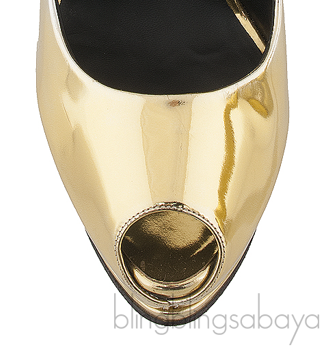 This pair of Gold Patent Peep Toe Pump from Giuzeppe Zanotti are made of gold metallic patent leather with black leather lining. These shoes features a an almond peep toe, covered platform and towering sexy heels measuring 150 mm high, leather lined insole and leather sole.