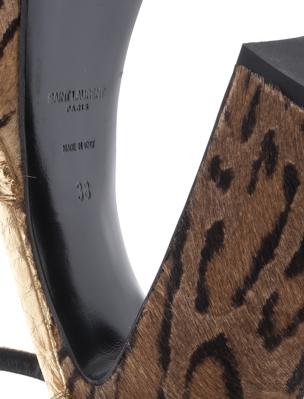 These Gold Python Candy Platform Sandals from Yves Saint Laurent are crafted in gold-tone leather, calfskin and black leather lining.These 'Candy' sandals features a crossover straps to the front, an ankle strap with a side buckle fastening, a calf hair platform sole, a leopard print, a chunky high heel and a snakeskin effect.