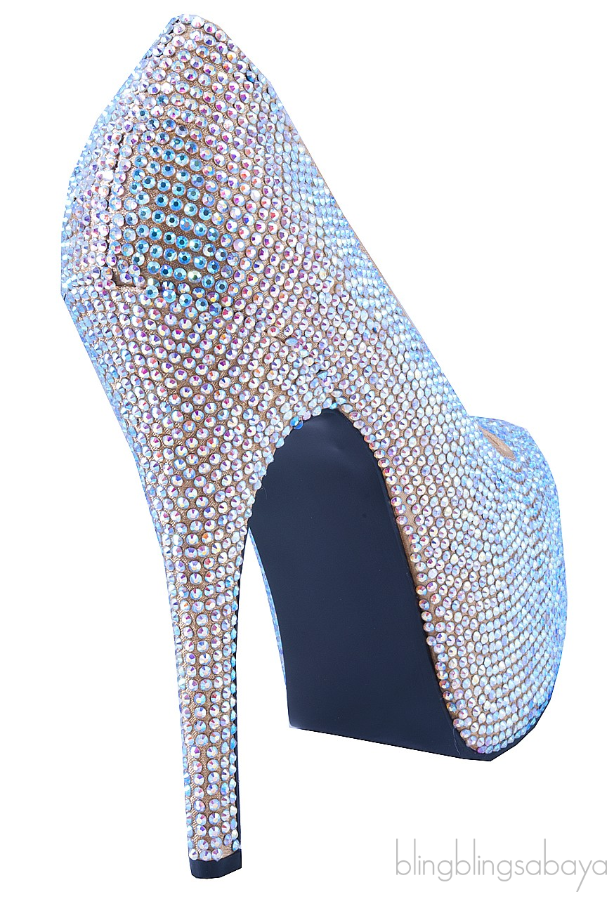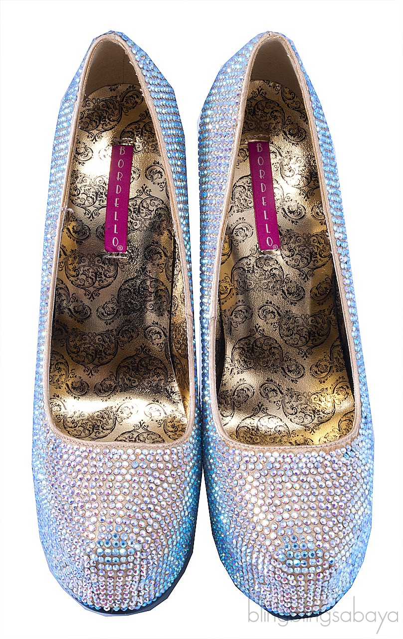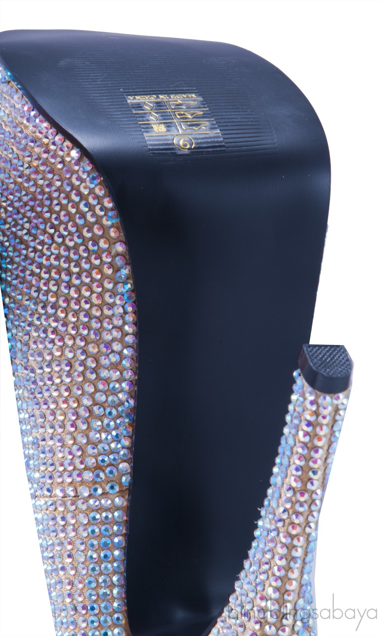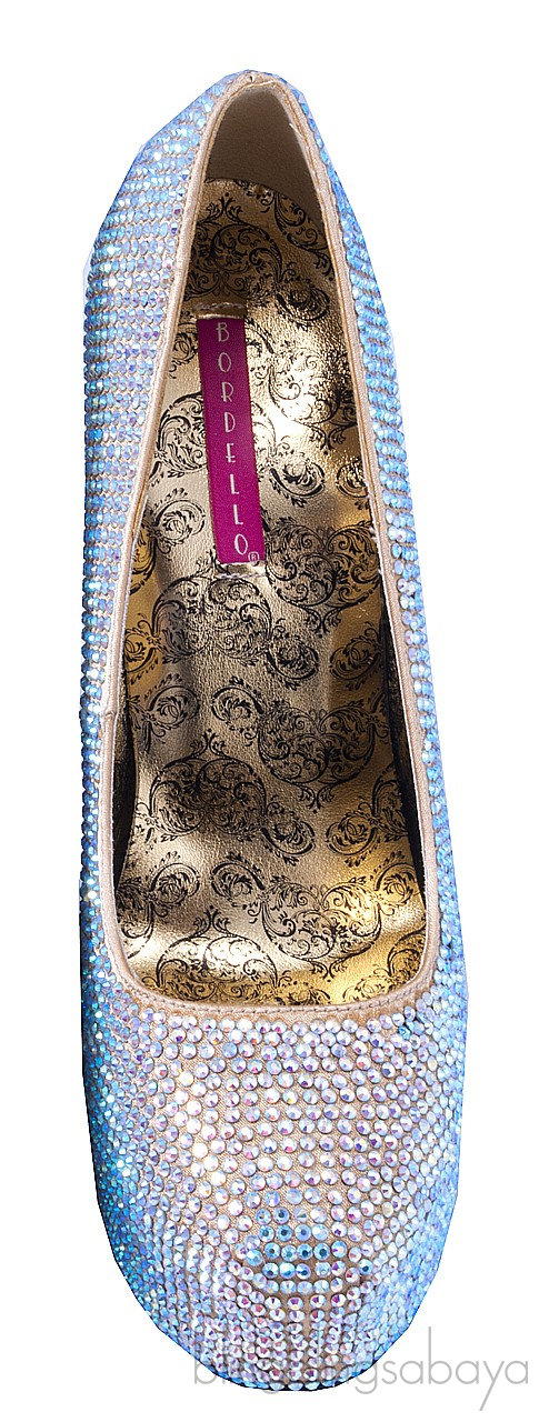 This glamorous satin Gold pump from Bordello is beautifully encrusted with irridescent Rhinestone all over. This features the towering heels measuring 150 mm, printed satin insole and black rubber sole.