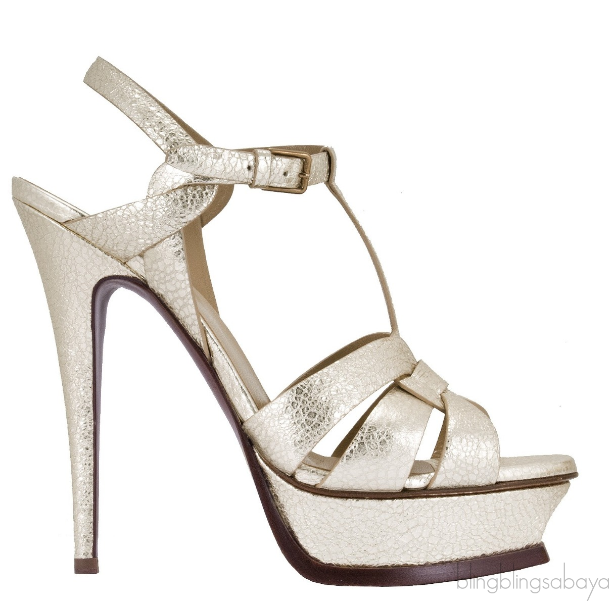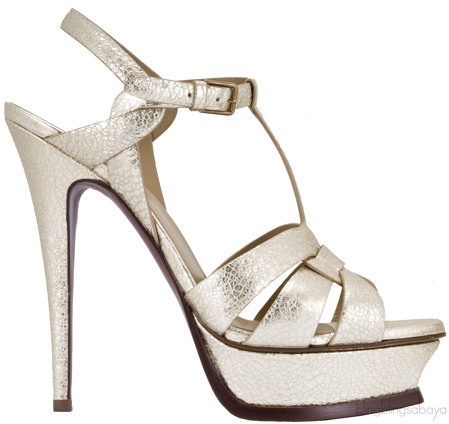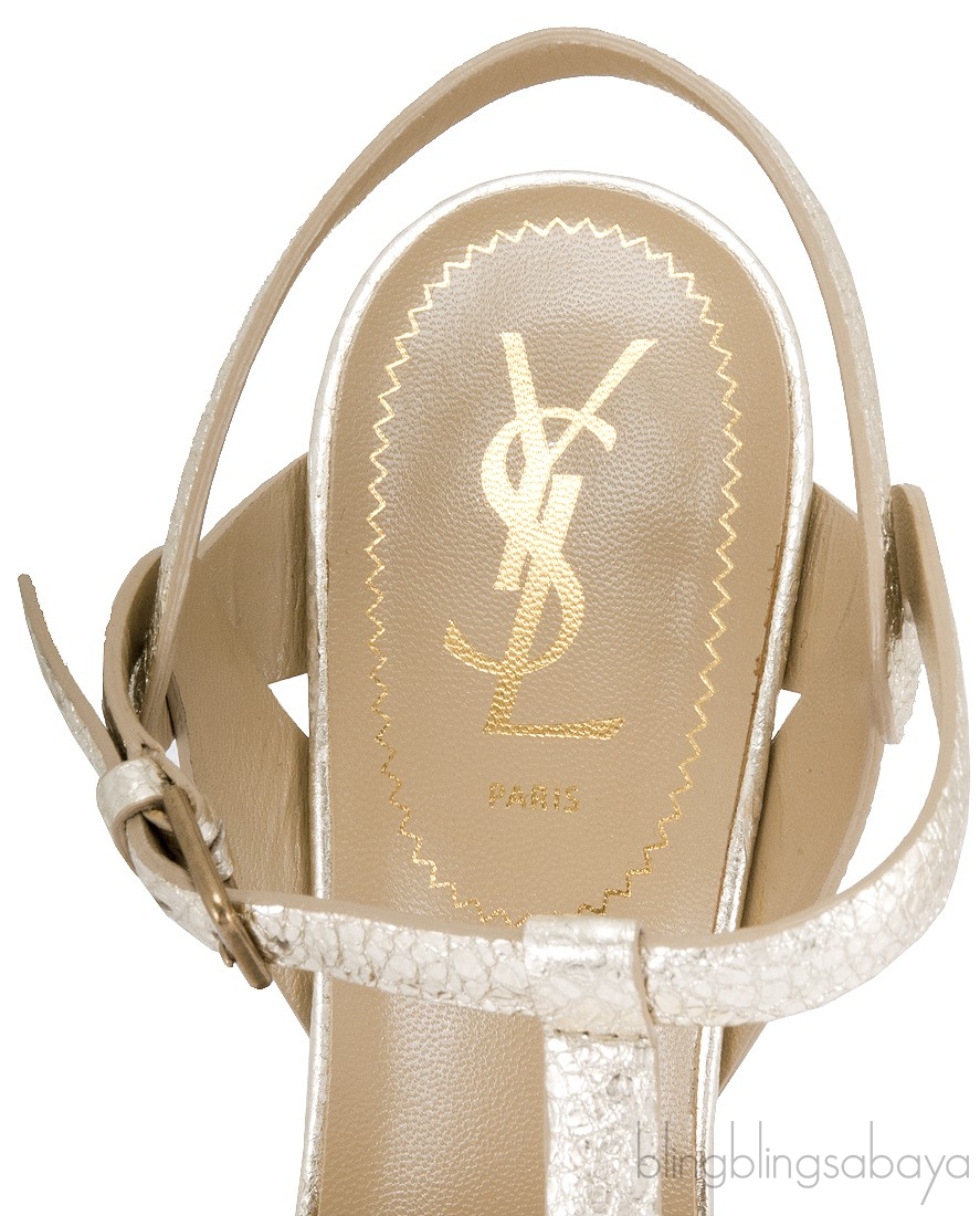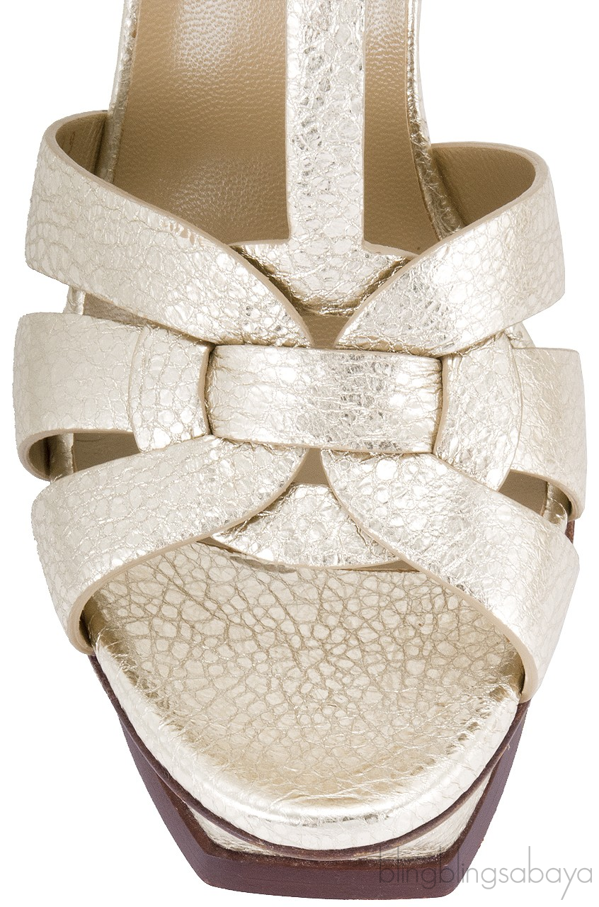 This Gold Textured Leather Tribute from Yves Saint Laurent is crafted in metallic textured gold leather with beige leather lining. This features an open toe with wide straps loop together over the vamp, adjustable T-strap with the golden buckle, padded insole and leather sole.
