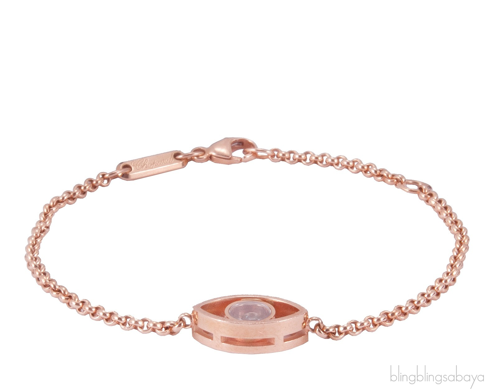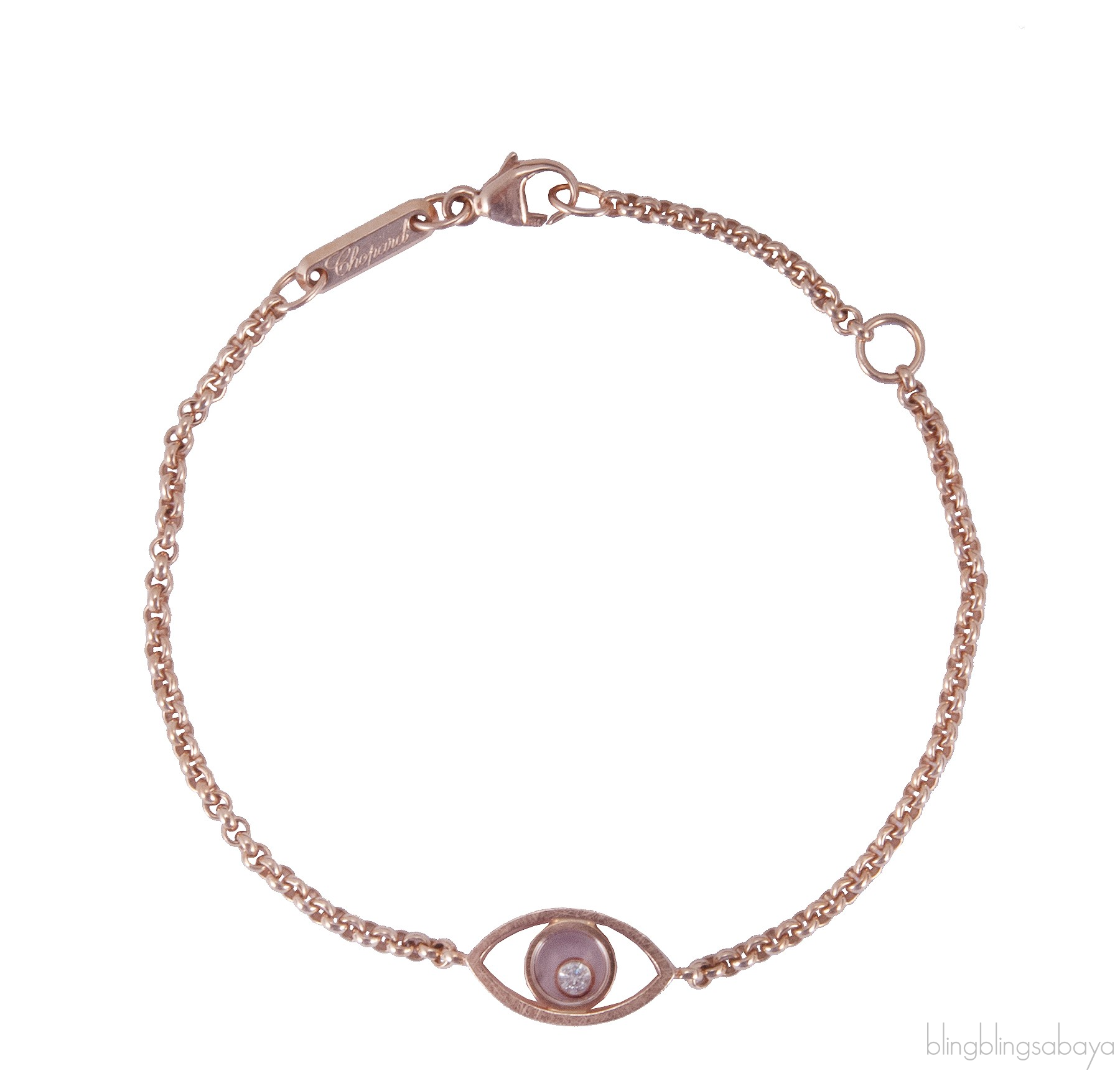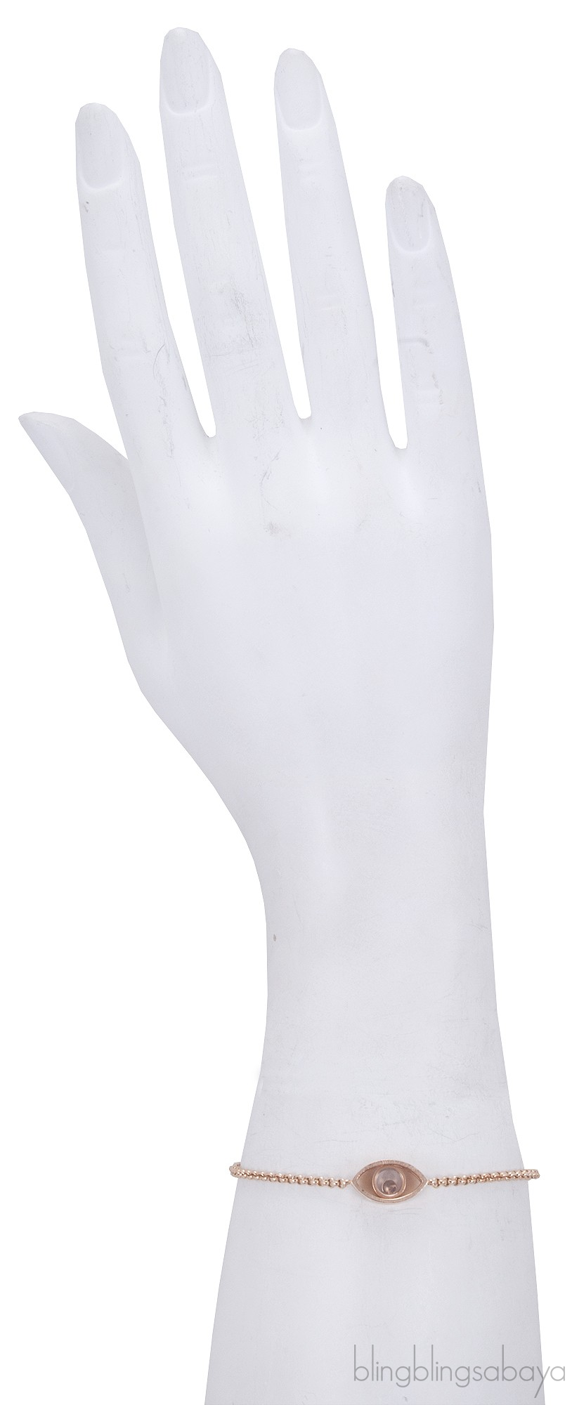 This playful Good Luck Charm Diamond Bracelet from Chopard is made of 18 kt Rose Gold Chain measuring 15 cm - 17 cm with lucky eye motifs with freely moving diamond inside and finished with a lobster closure.