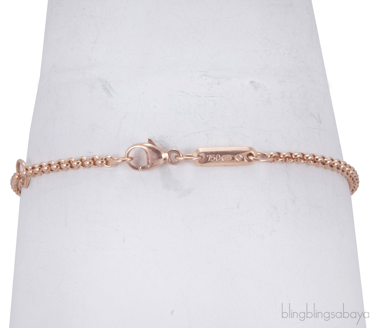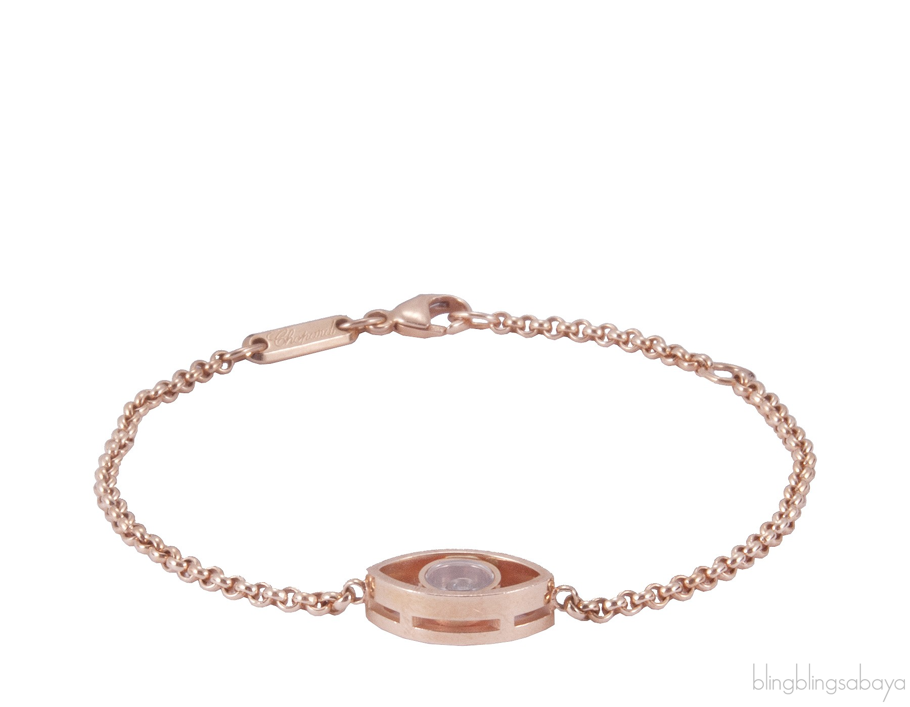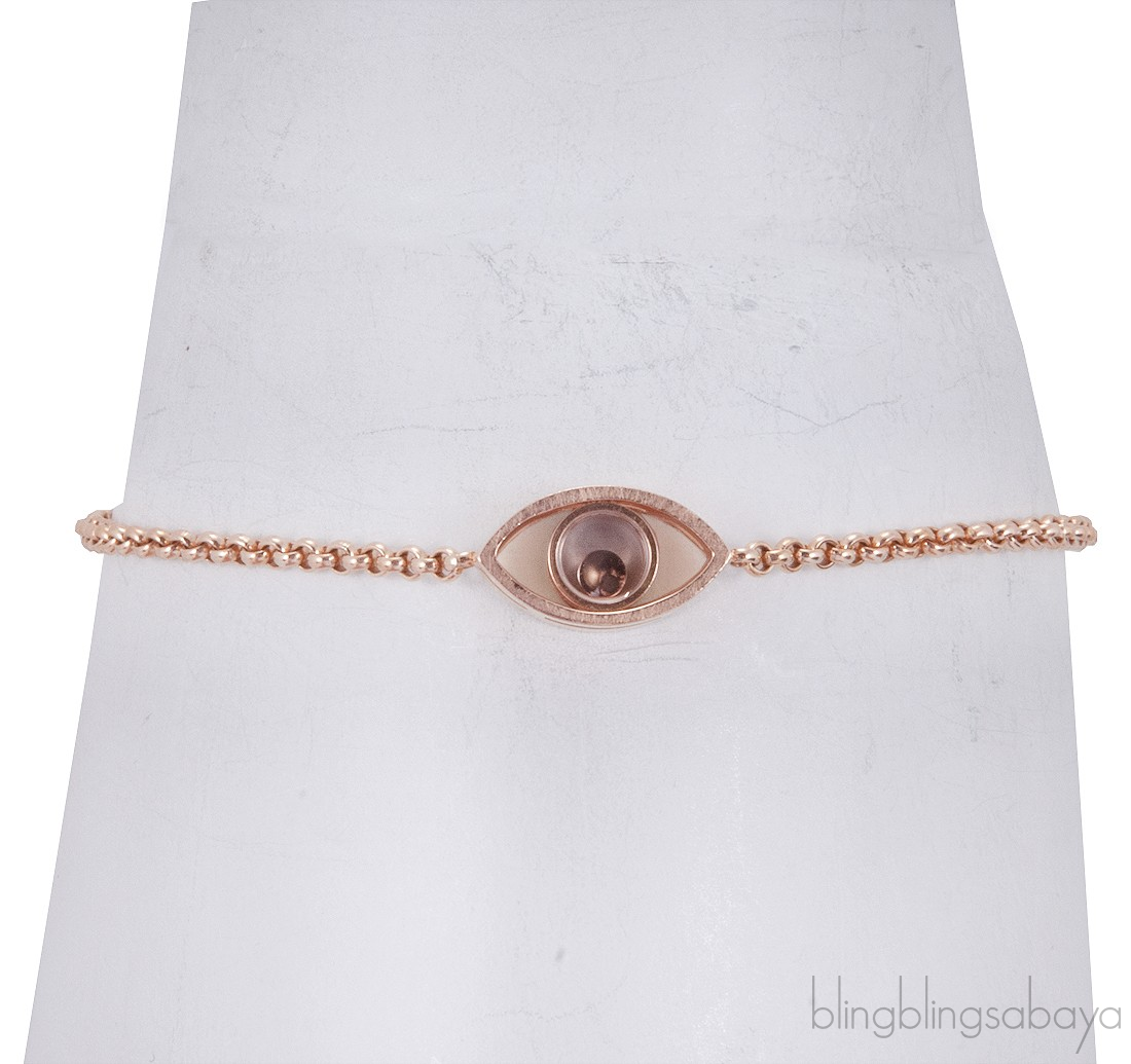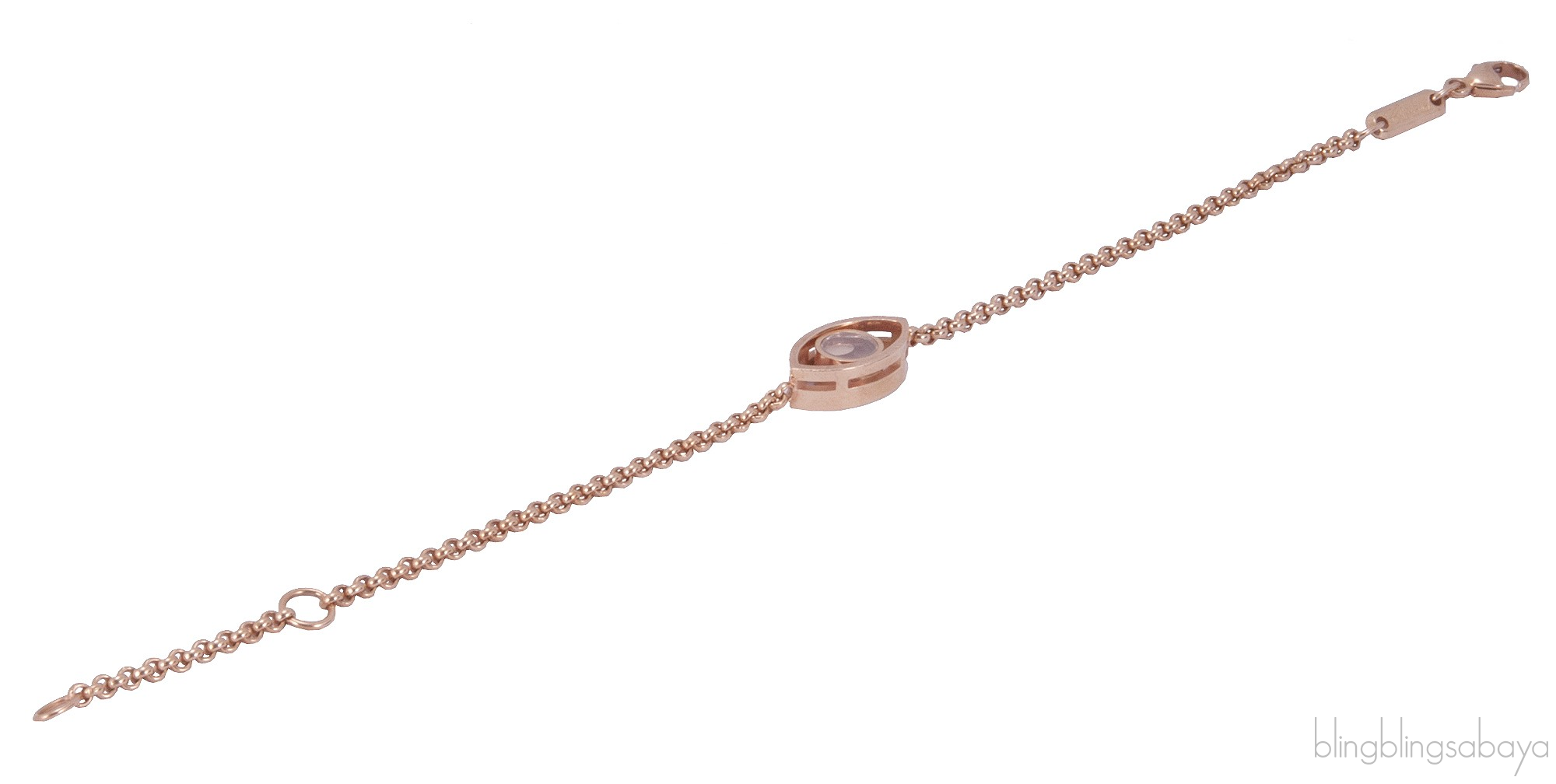 This playful Good Luck Charm Diamond Bracelet from Chopard is made of 18 kt Rose Gold Chain measuring 15 cm - 17 cm with lucky eye motifs with freely moving diamond inside and finished with a lobster closure.
