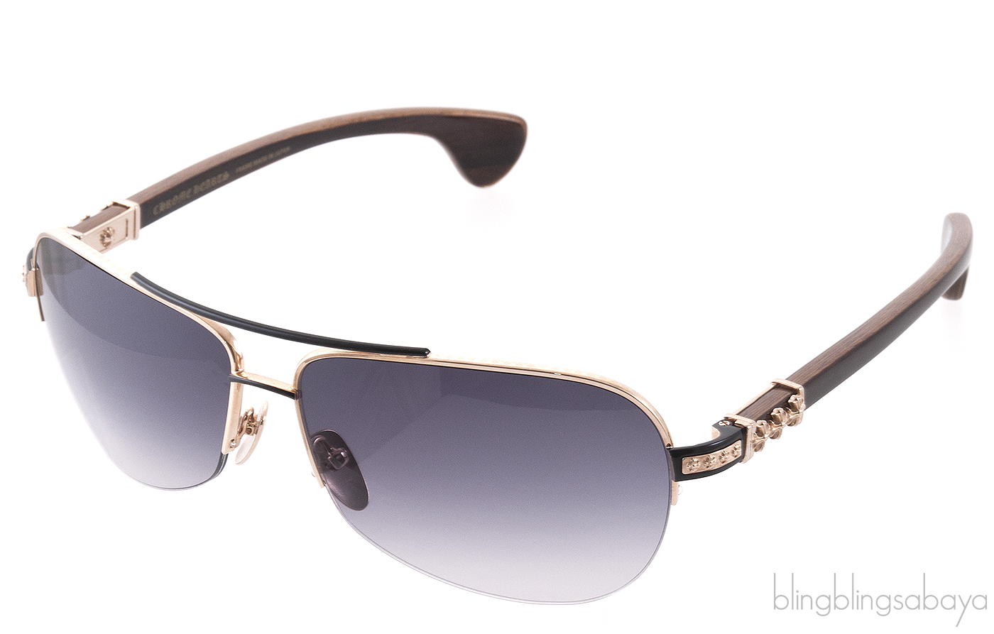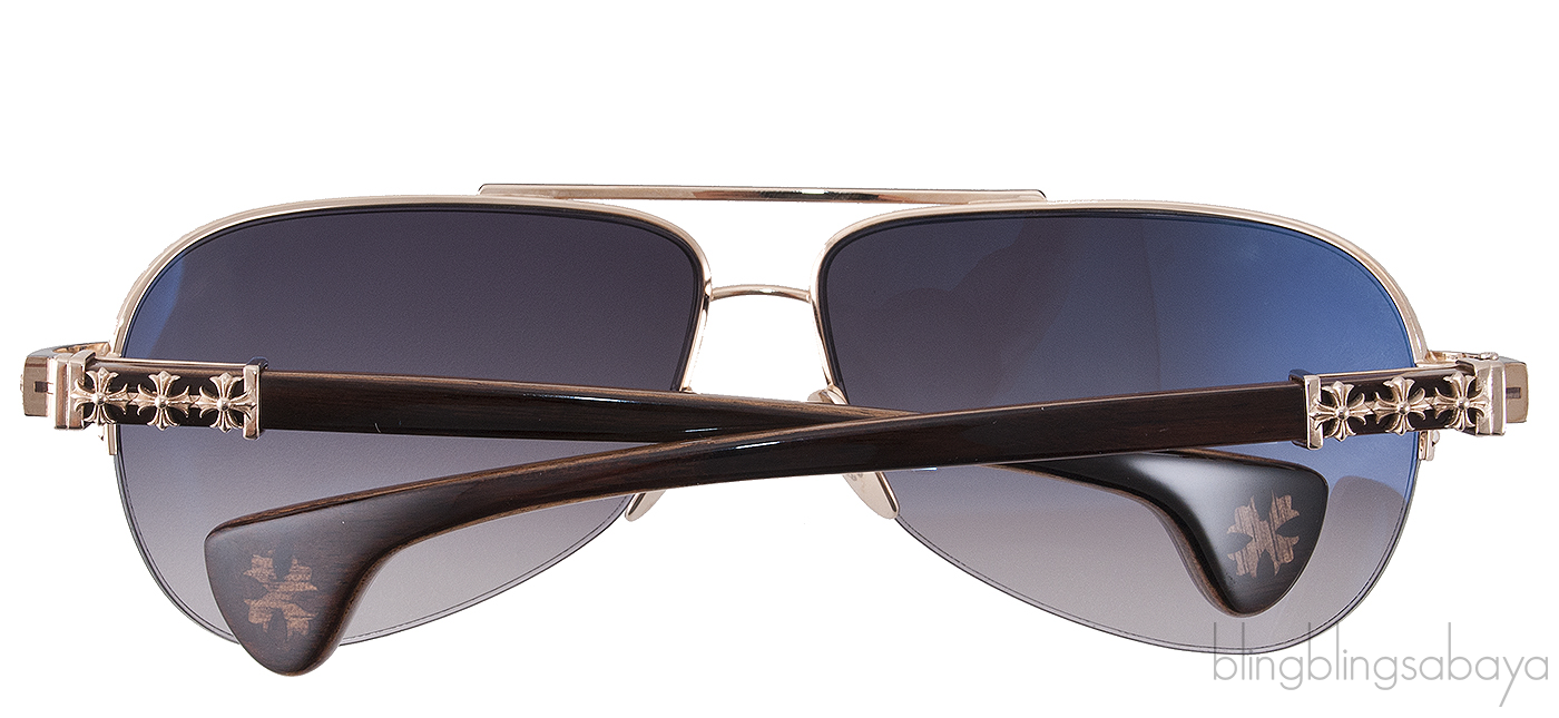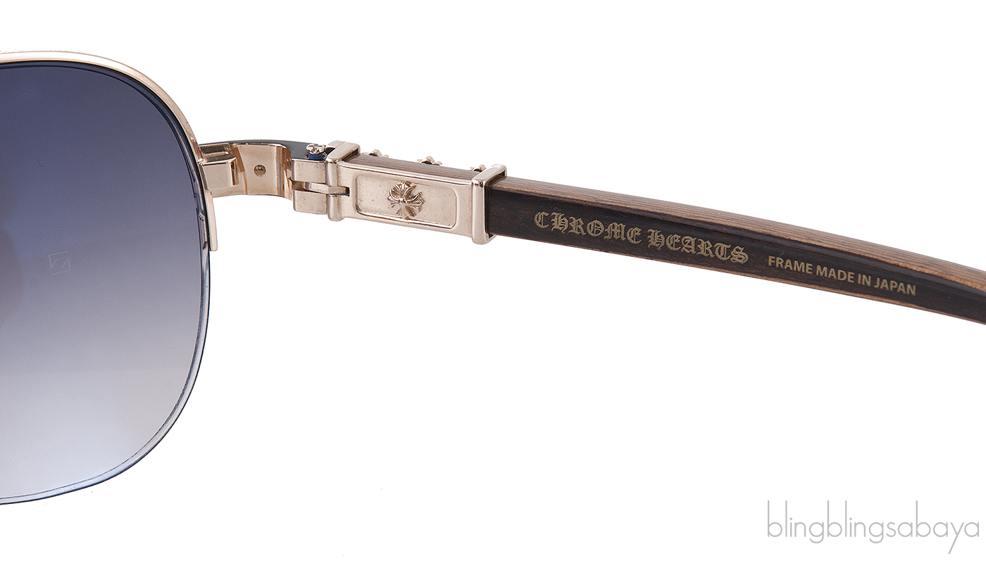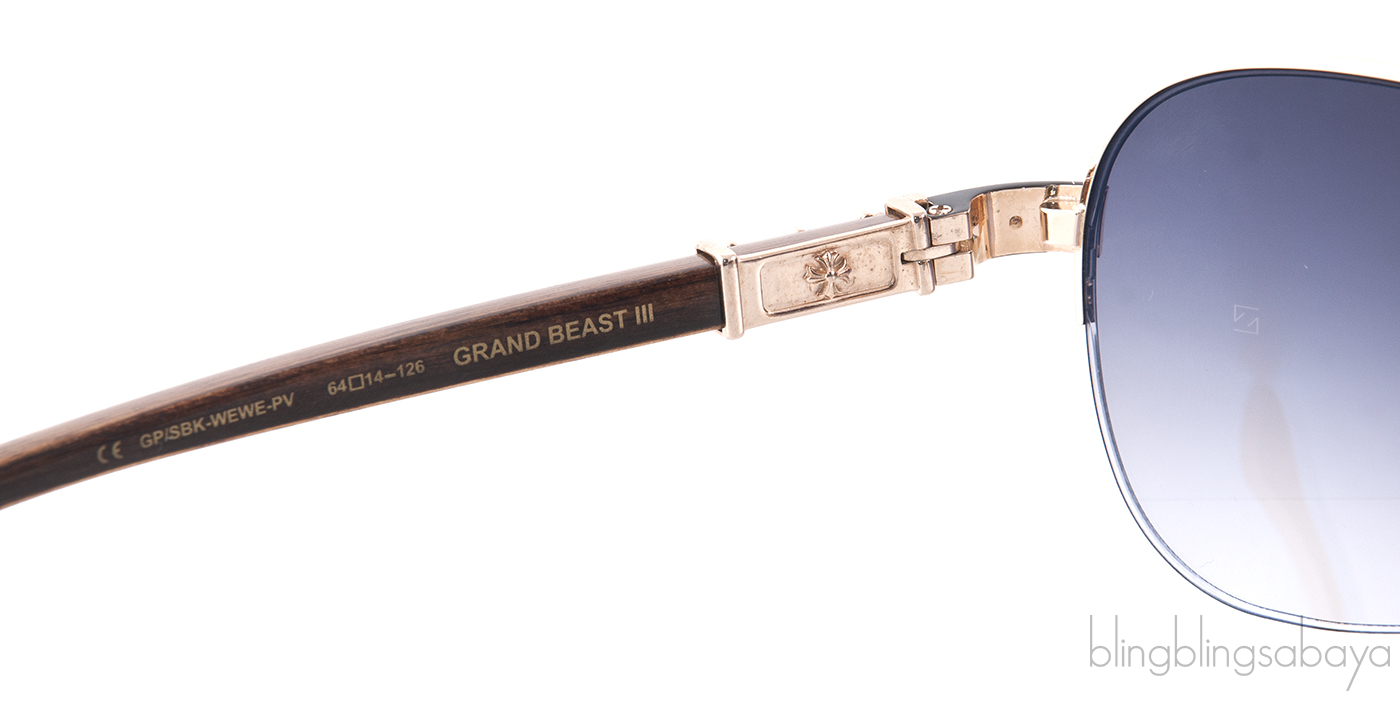 This Grand Beast III Sunglasses from Chrome Hearts is features a gold metal frames with with Piano Varnish Temples decorated with metal gold Chrome Hearts logo2s, sweat bars, nose pads and gradient lenses measuring 64 mm / Bridge 14 mm / Arms 126 mm.