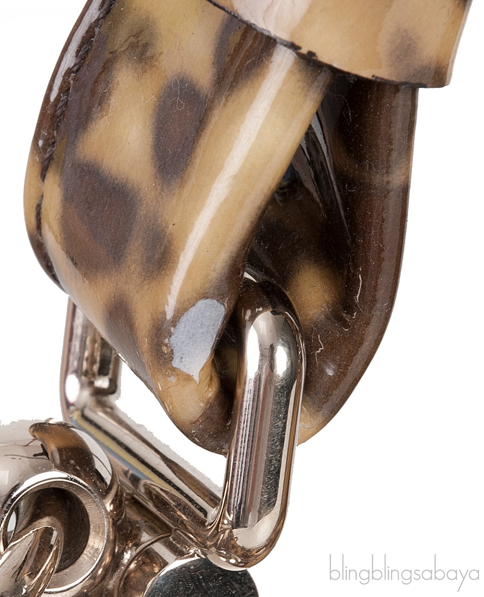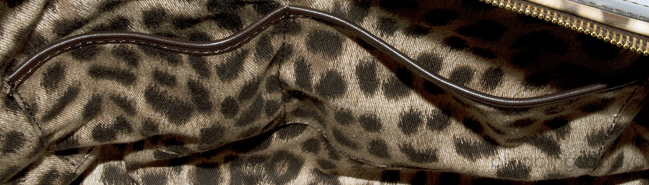 It has the single flat leather handle and has detachable shoulder strap.The top zip opening gives access to the very roomy interior fully lined with leopard print fabric and reveals one zipped large pocket and two open pockets inside.