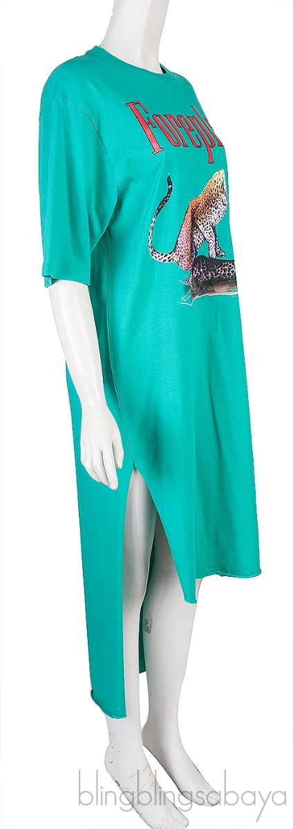 This Green Cotton-jersey T-shirt Dress from Christopher Kane is crafted from 100% Cotton fabric in green color. This t-shirt dress features a round neckline, short sleeve, side slits, leopard and foreplay printed across the front and printing at the back with long back hemline.
