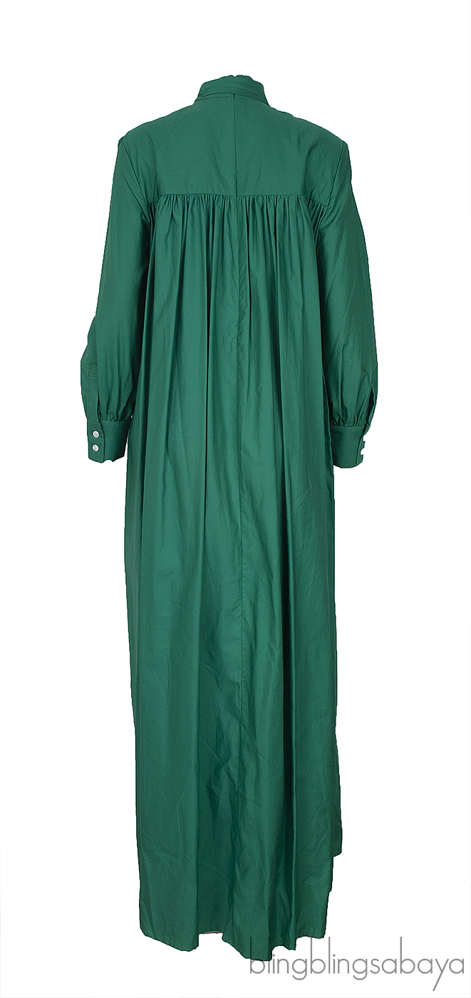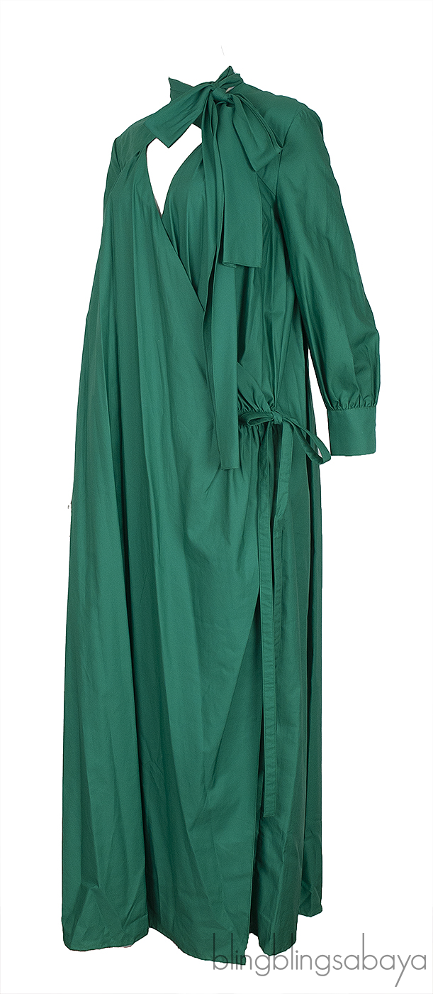 This Green Fake Wrap Maxi Dress from Rosie Assoulin in crafted from 100% Cotton fabric in green hue. This dress features a high necktie, keyhole neckline, long sleeves with button cuffs, wrap effect waist tie, side pockets and maxi length.