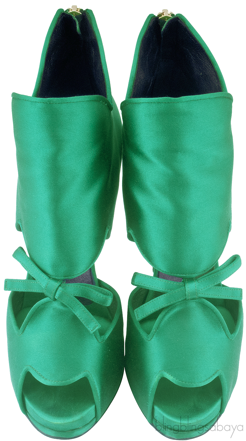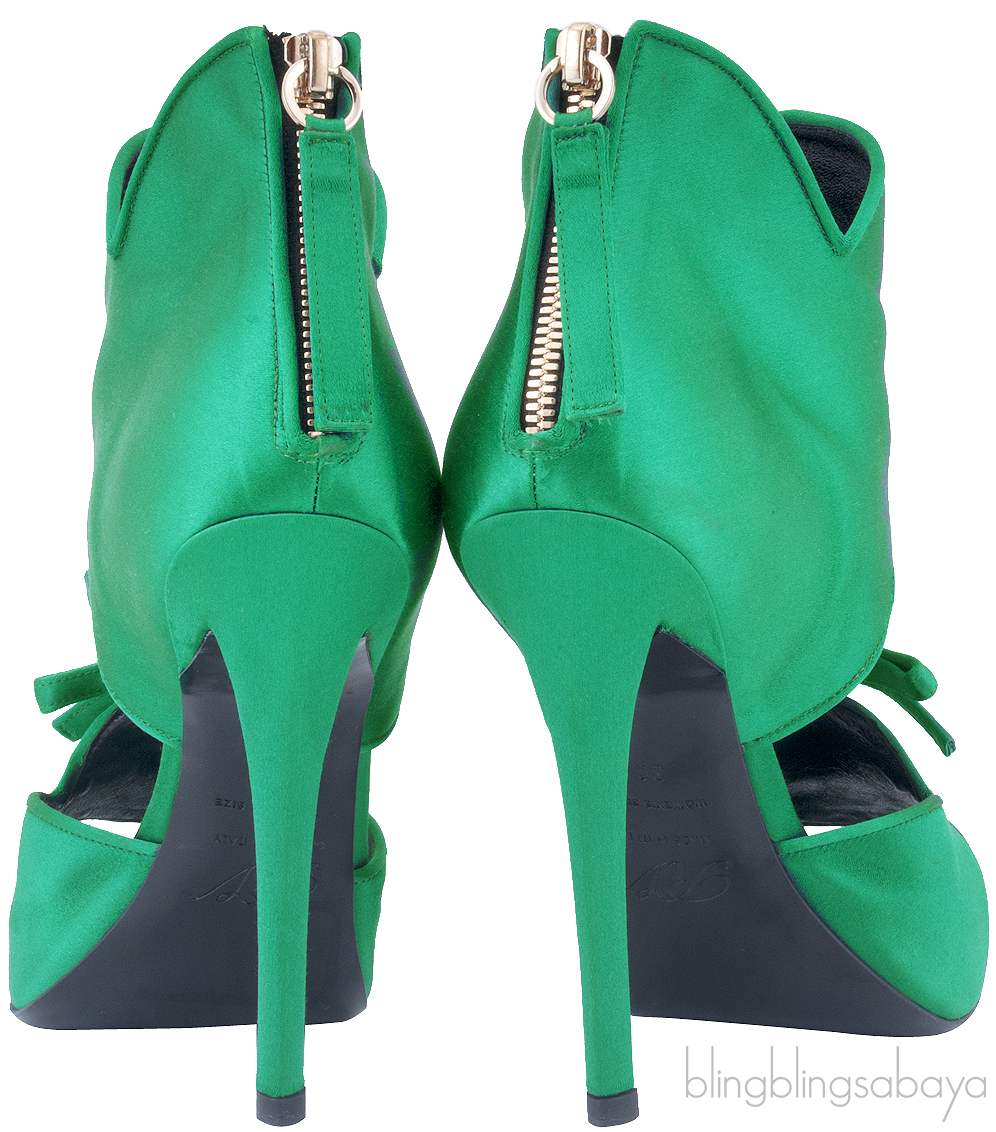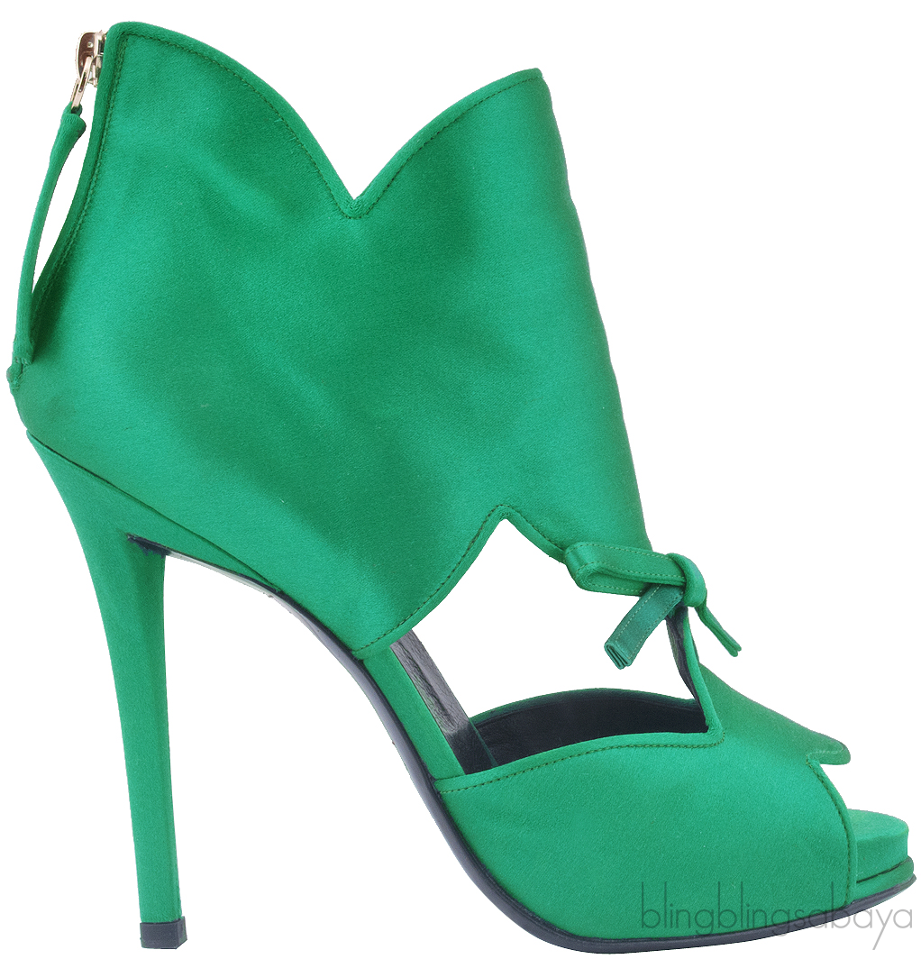 This Green Satin Cloud Pump from Roger Vivier is crafted in vivid green satin fabric upper featuring an open almond toe, bow detailing at front, cut out design with side panels, back zip closure, black leather lining, covered heels measuring 120 mm high and black leather sole.