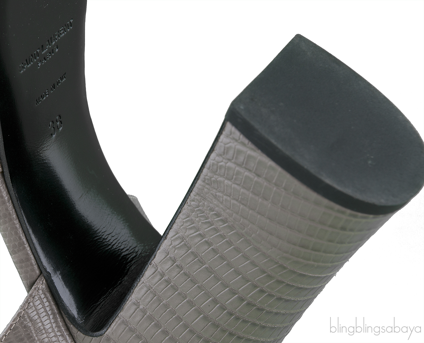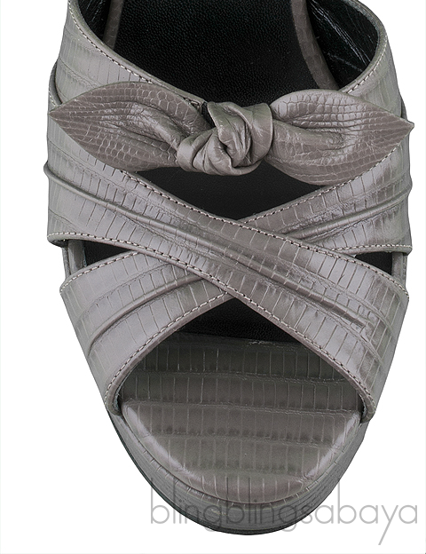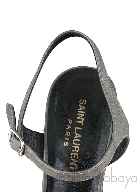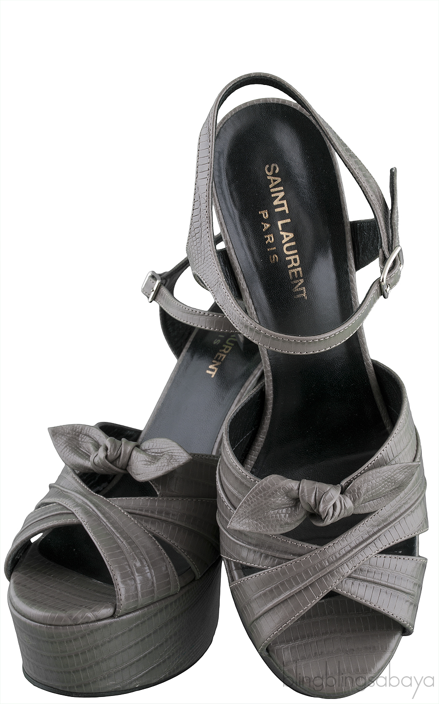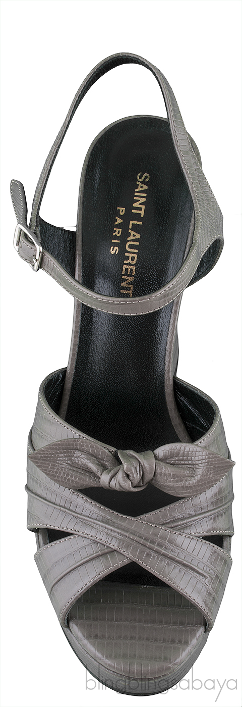 These Grey Bow Textured Leather Pump from Yves Saint Laurent are crafted in grey lizard print textured leather with leather lining. these heels features a bow and criss cross detailing at vamp, peep almond toe that sits 5 cm platform, ankle strap with silver buckle, stacked heels measuring 130 mm high and leather sole.