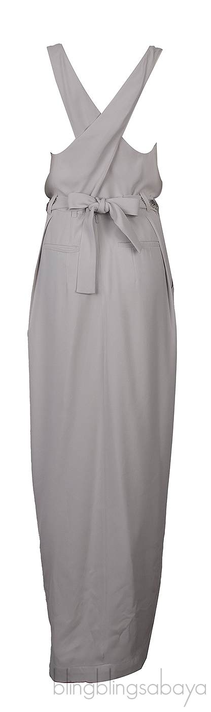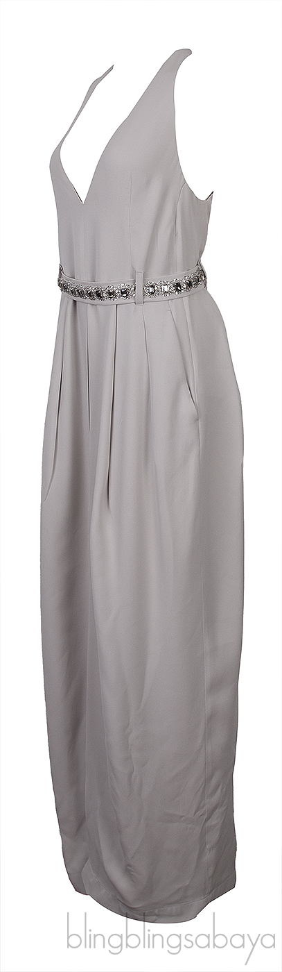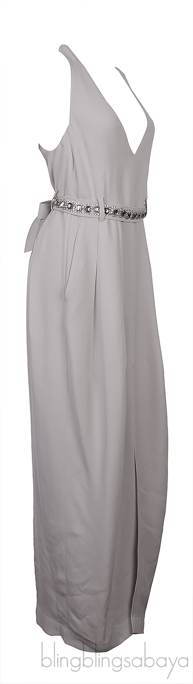 This Grey Crystal Belted Dress from Fendi is crafted from grey plain fabric festuring a plunging neckline, sleeveless, criss cross at back with zip fastening, two side pockets at patch pockets at rear, belt loops at at waist, detachable fabric belt with crystal embellishment and maxi length with front slit.