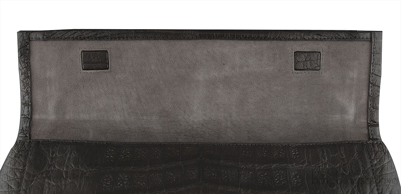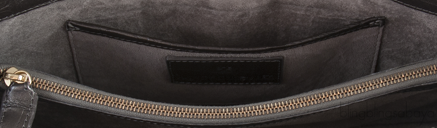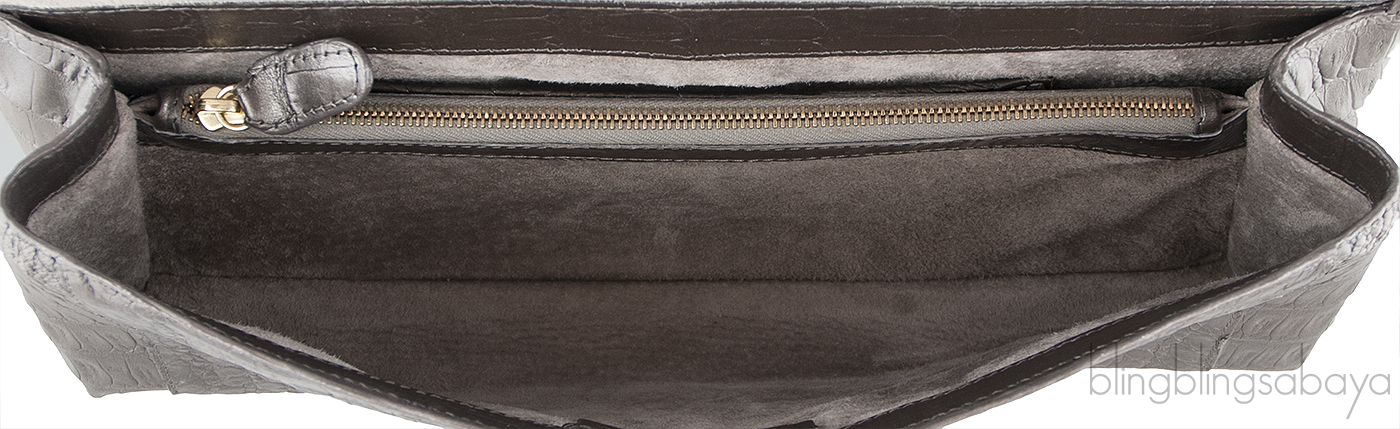Interior is lined with light grey suede leather has two major compartments divided with a zip compartment at mid-center and has one patch pocket with leather trim and small crocodile patch pocket inside.