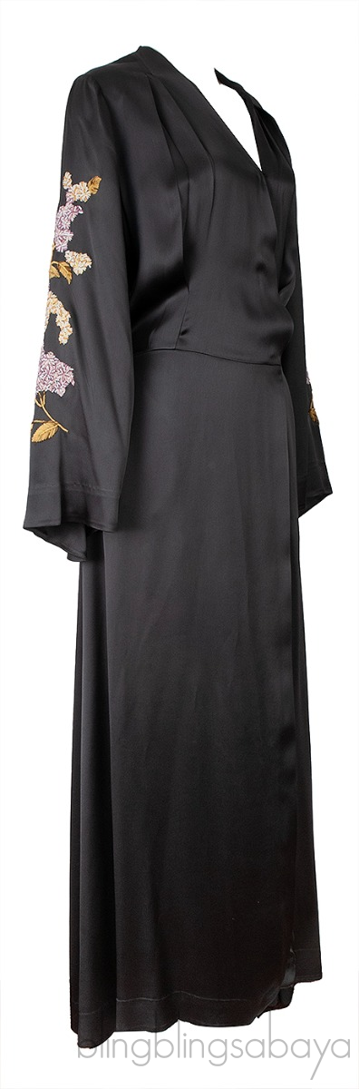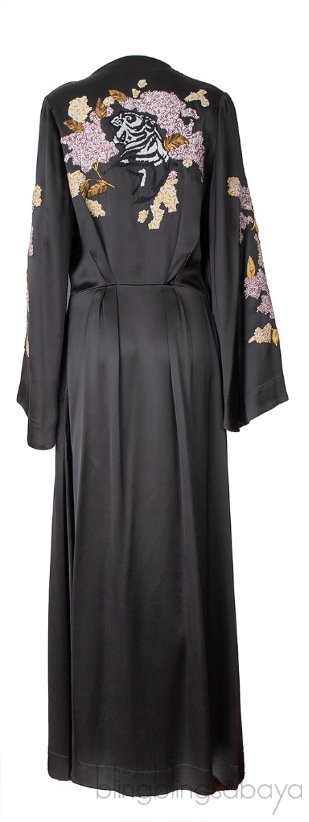 This Grey Satin Embroidered Robe from Attico is crafted from 83% Acetate and 7% Viscose in grey hue. This robe features a bird and flower embroidery at back and on the sleeves, kimono sleeves, v-neckline, snap fastening at front and hook at waistline and maxi length.
