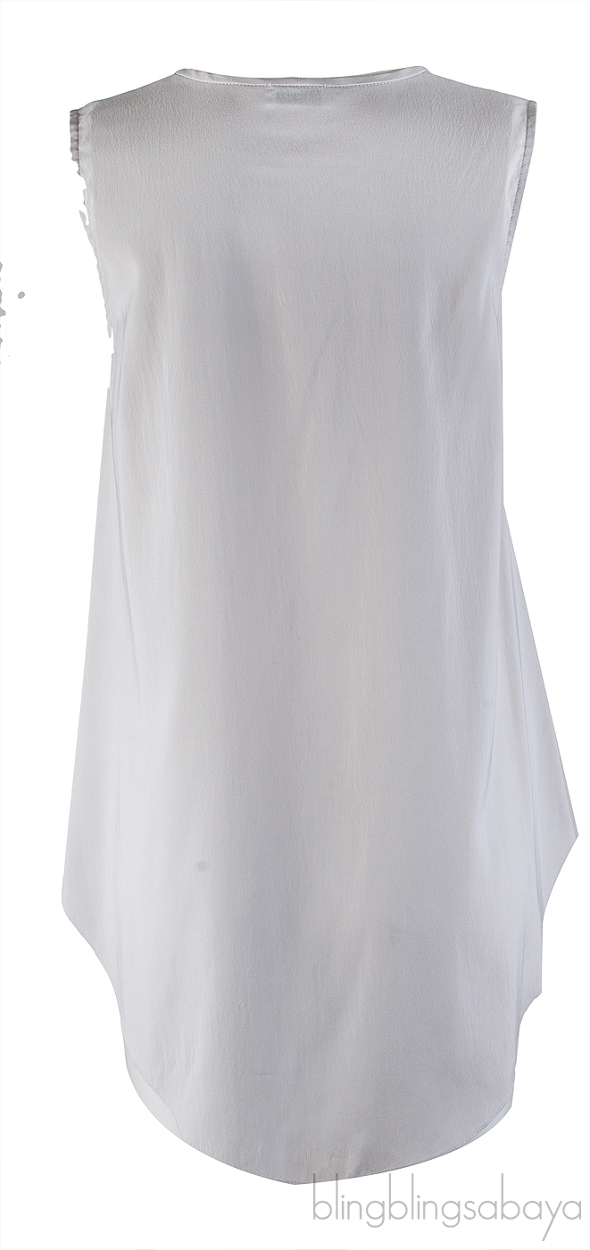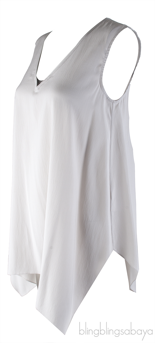 This Grey Sleeveless Blouse from Brunello Cucinelli is crafted from 92% silk and 8% Elastane in light grey hue. This blouse features a sleeveless design, v-neckline with metal chain detailing, pull-over, a-line cut with asymmetric hemline.