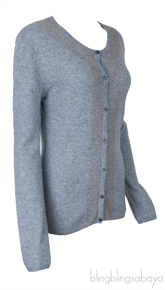 This Grey Wool Beaded Cardigan from Escada is crafted from 70% Wool and 30% cashmere. This cardigan in grey huw featuring a ribbed round neckline, button fastenign through the front, long sleeves with ribbed cuff and hemline and gold bead embellishment at front.