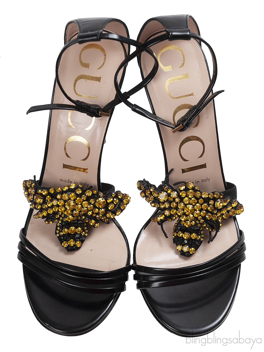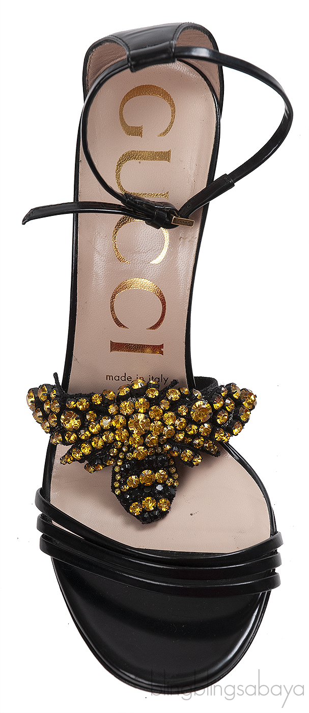 This Black Bee Embellished Crystal Sandals from Gucci is crafted from black patent leather and nude leather lining. These sandals features a three leather straps at vamp, peep almond tow, slingback with gold fastening, stiletto heels measuring 100 mm high, leather lined sole, optional black elastic strap with embellished crystal bee.