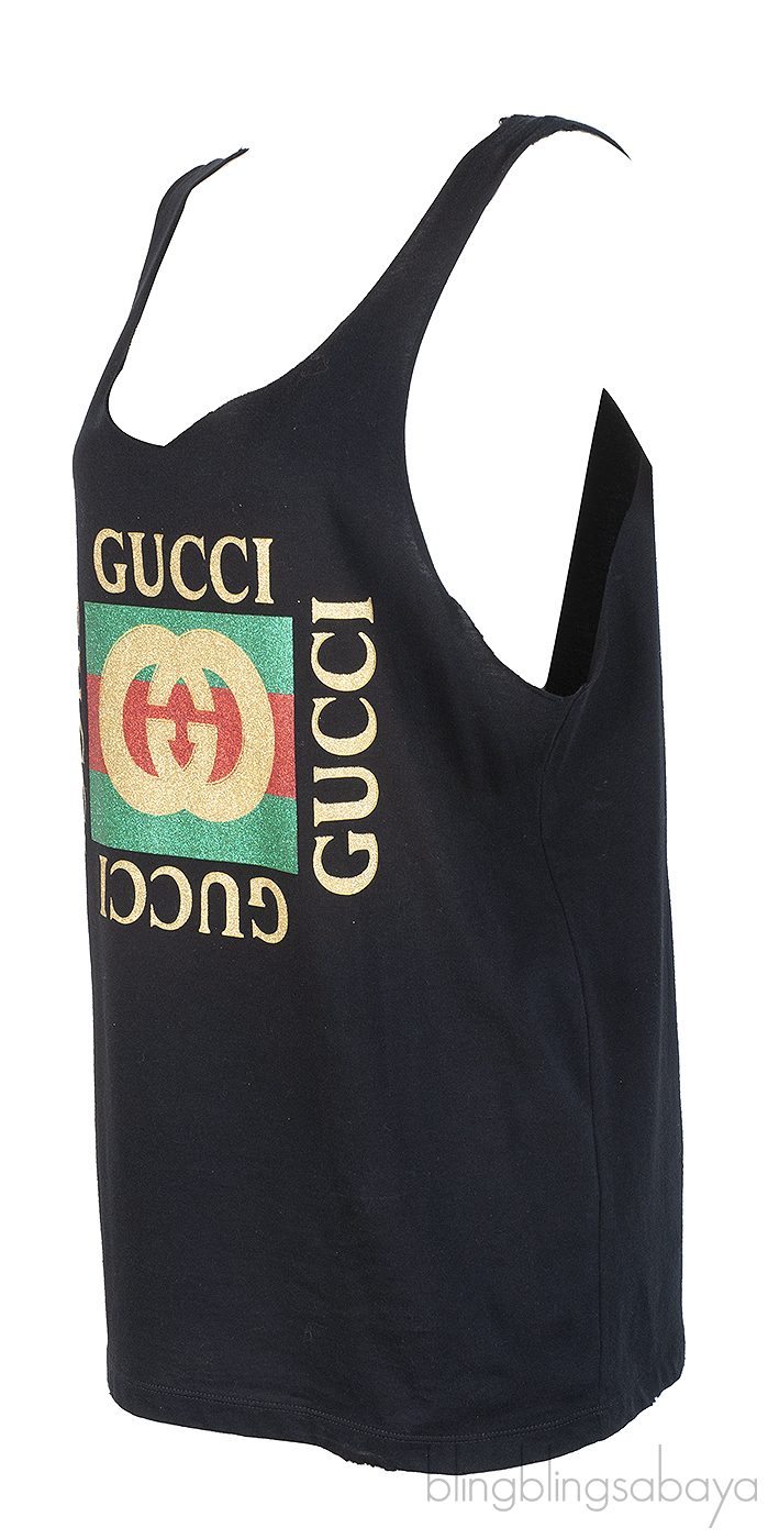This Gucci Black Vintage Printed Tank Top from Gucci is crafted from black soft comfortable printed fabric featuring a scoop neckline, sleeveless, pull-over, and brand and interlocking G print at front.