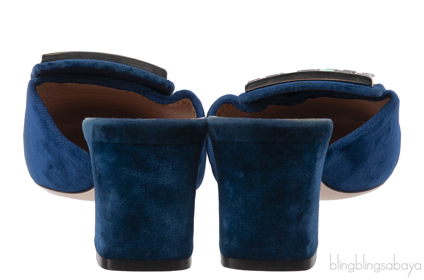 This Blue Velvet Crystal Madelyn Mules from Gucci is crafted from blue velvet upper with nude leather lining. These mules feature a slightly square toe with G logo2 at vamp encrusted with crystals, leather lined insole, leather sole and stacked heels measuring 65 mm high.