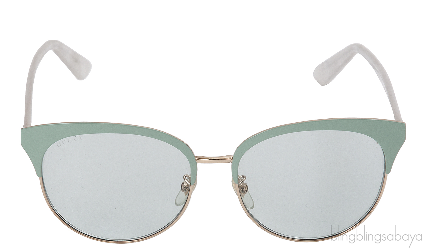 This GG0246SA 003 Sunglasses from Gucci features a rounded frame in gold and green with light green lenses, pearl arm with gold bee engraving, nose pads.