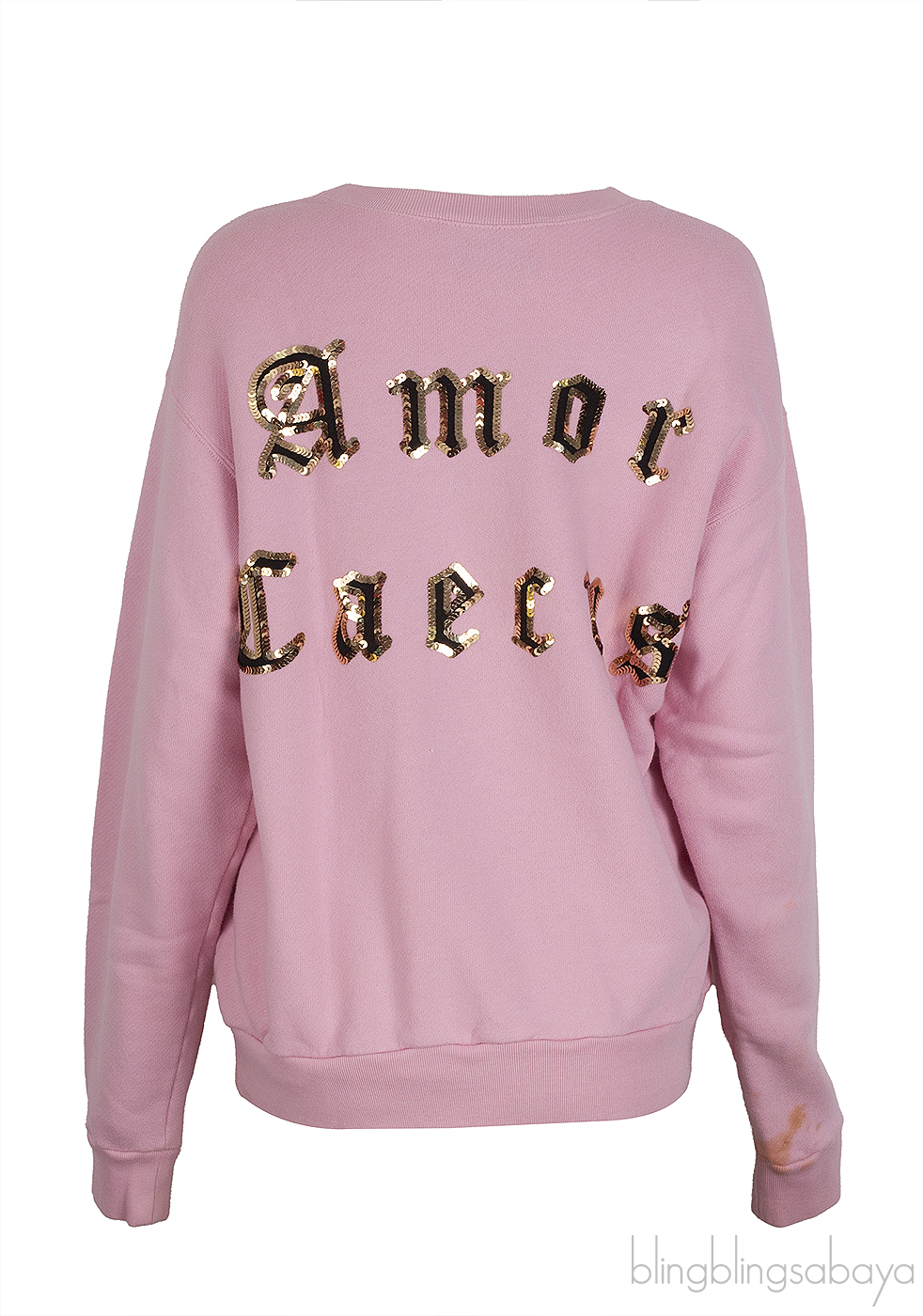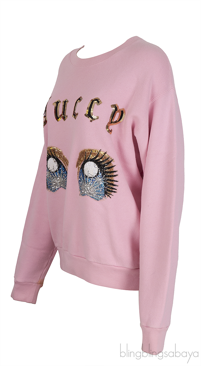 This Guccy Pink Sequin Embellished Sweatshirt from Gucci crafted from pink cotton fabric featuring a round neckline, long sleeves, Guccy and eye sequin embellishment at the front and Amor caecus design at the back , ribbed cuffs and hemline.