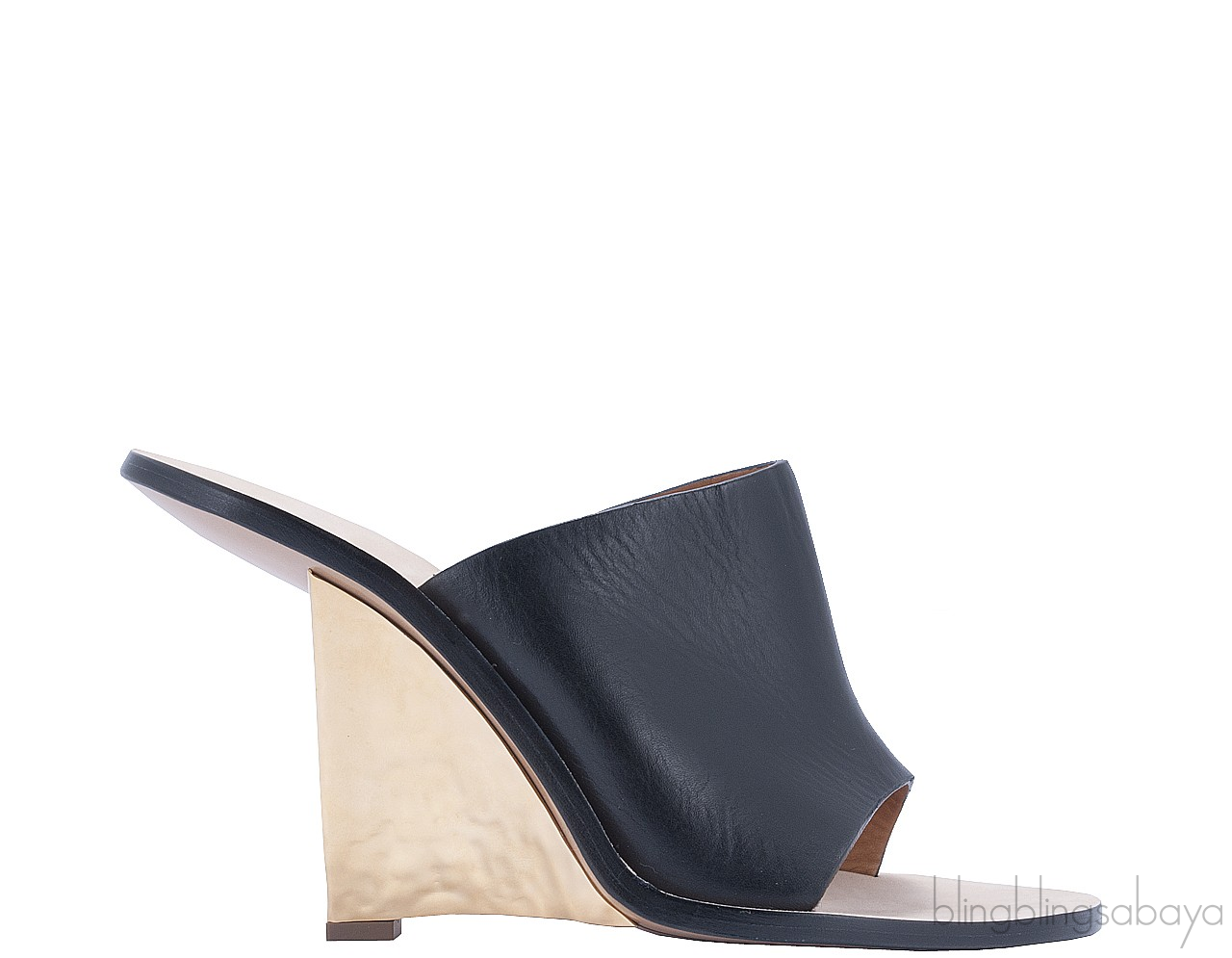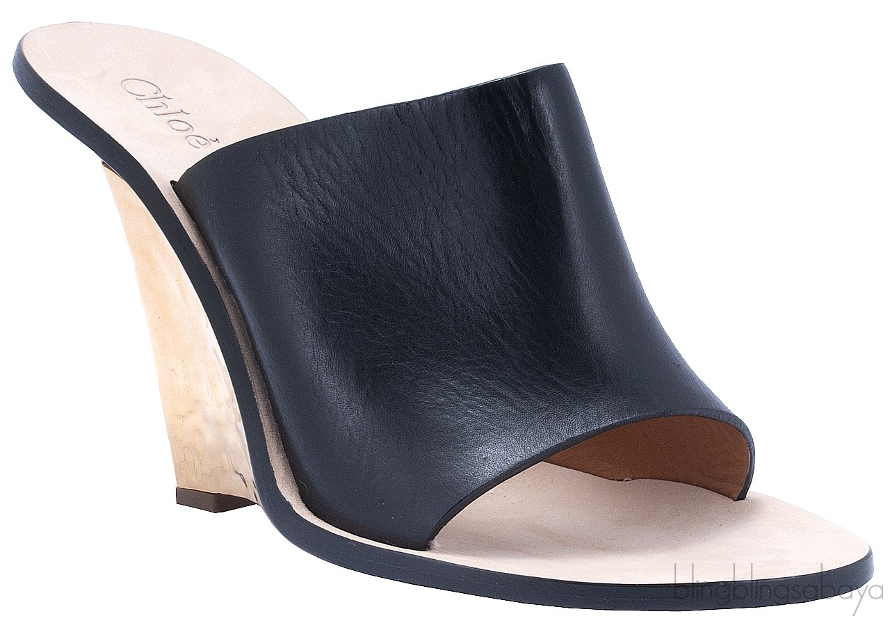 This super chique mule wedge sandals from Chloe is crafted in large black leather upper and cut-away gold hammered wedge heels. This wedge features a Chloe stamped beige insole, rounded toe and leather sole.