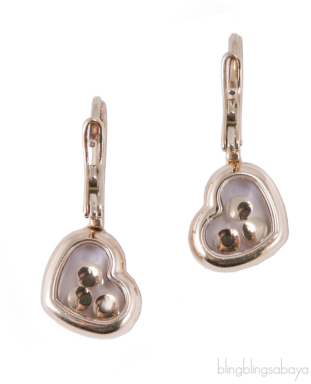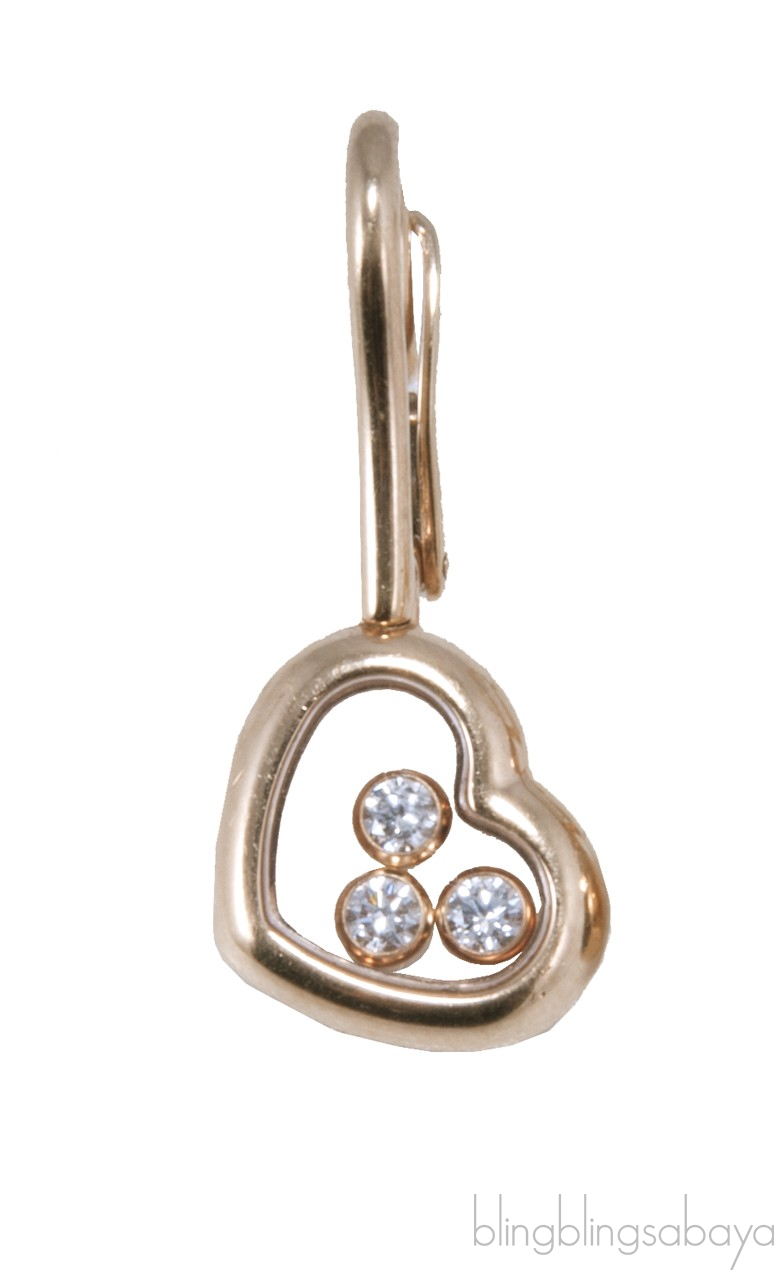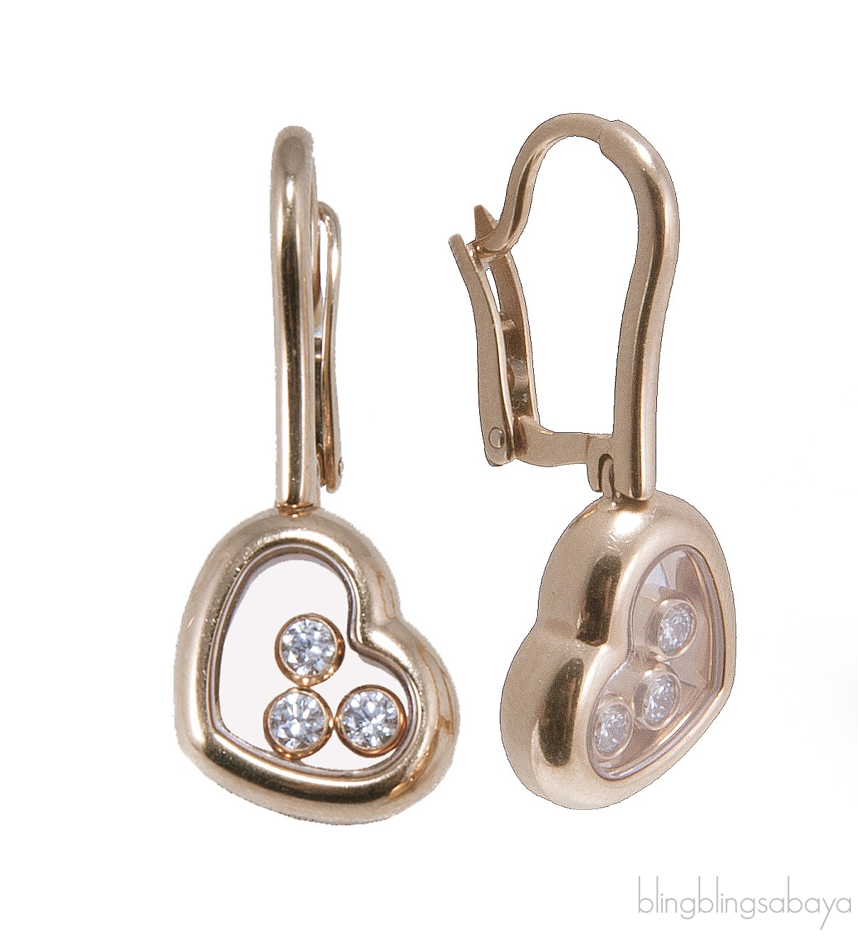 This sweet lovely Heart Happy Diamond Earrings from Chopard is crafted in 18 kt Rose Gold with three precious floating Diamond that freely moving and spin around under the sapphire glass crystal.