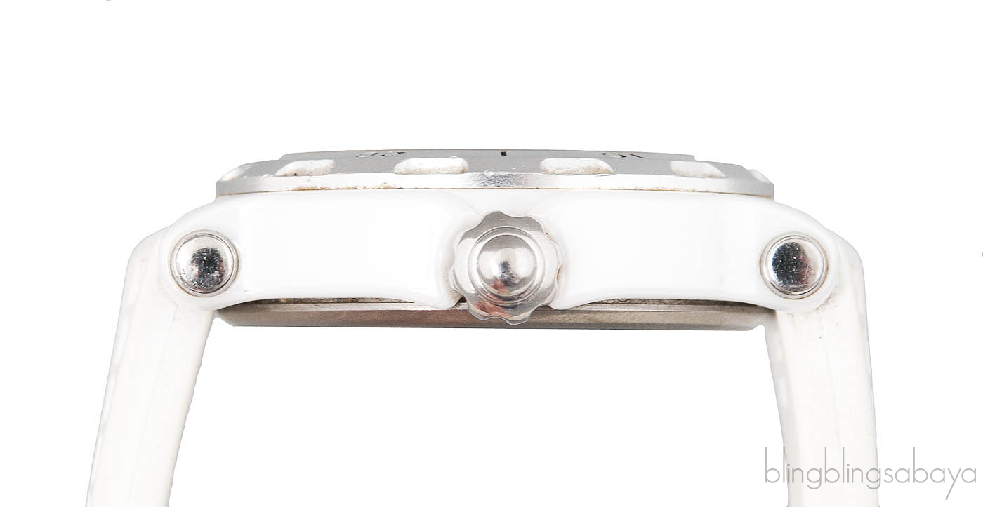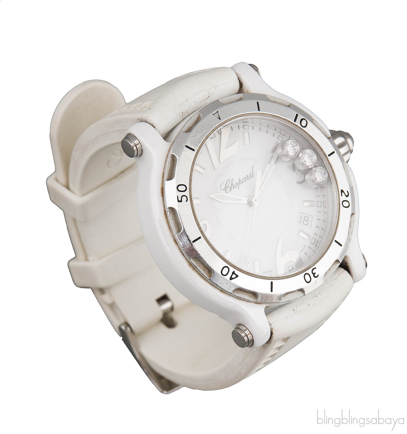 This elegant Limited Edition Chopard Happy Sport watch is crafted in White Ceramic case with white rubber strap. It has the floating three diamonds weighing 0.30 ct in white dial with luminous hands. The jewels are floating inside the case with every move making it whimsical.
