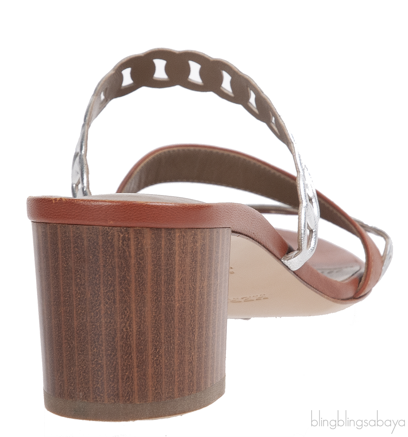 These Brown Ajaccio Sandals from Hermes are crafted from leather featuring a silver chain d\'ancre and brown strap, peep almond toe, leather lined insole and sole and a chunky 2.25-inch heel.