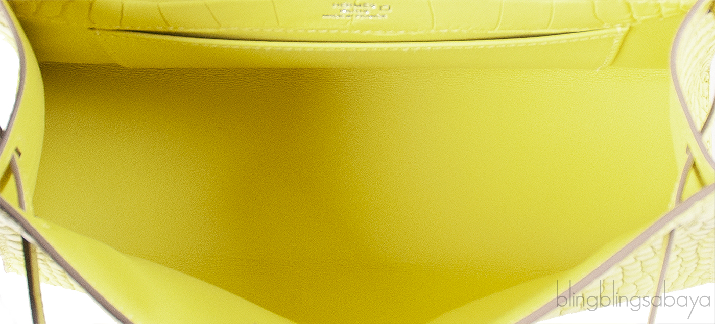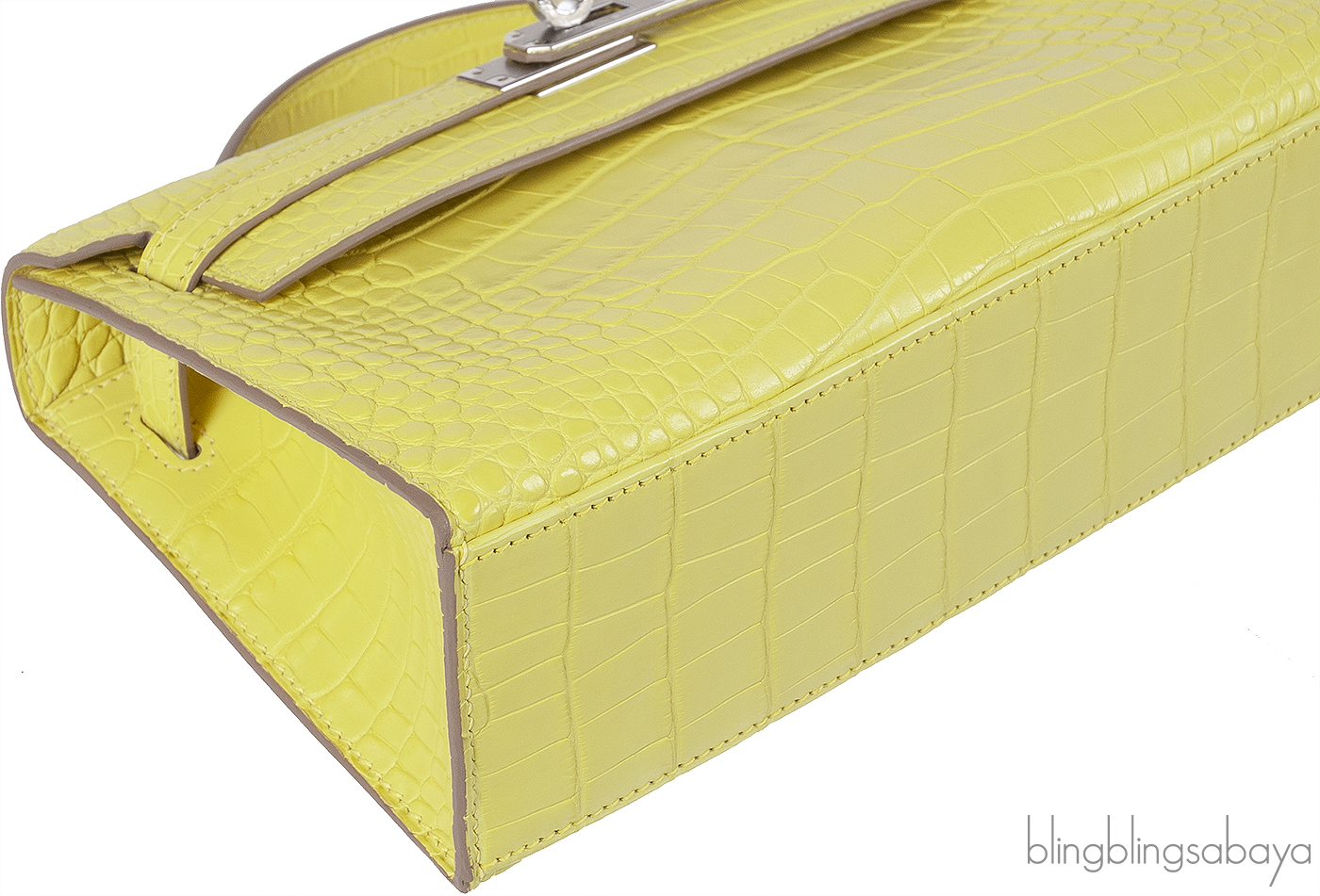 This HERMES Kelly Pochette Lime Matte Alligator Crocodile PHW is crafted from luxurious exotic alligator crocodile leather,