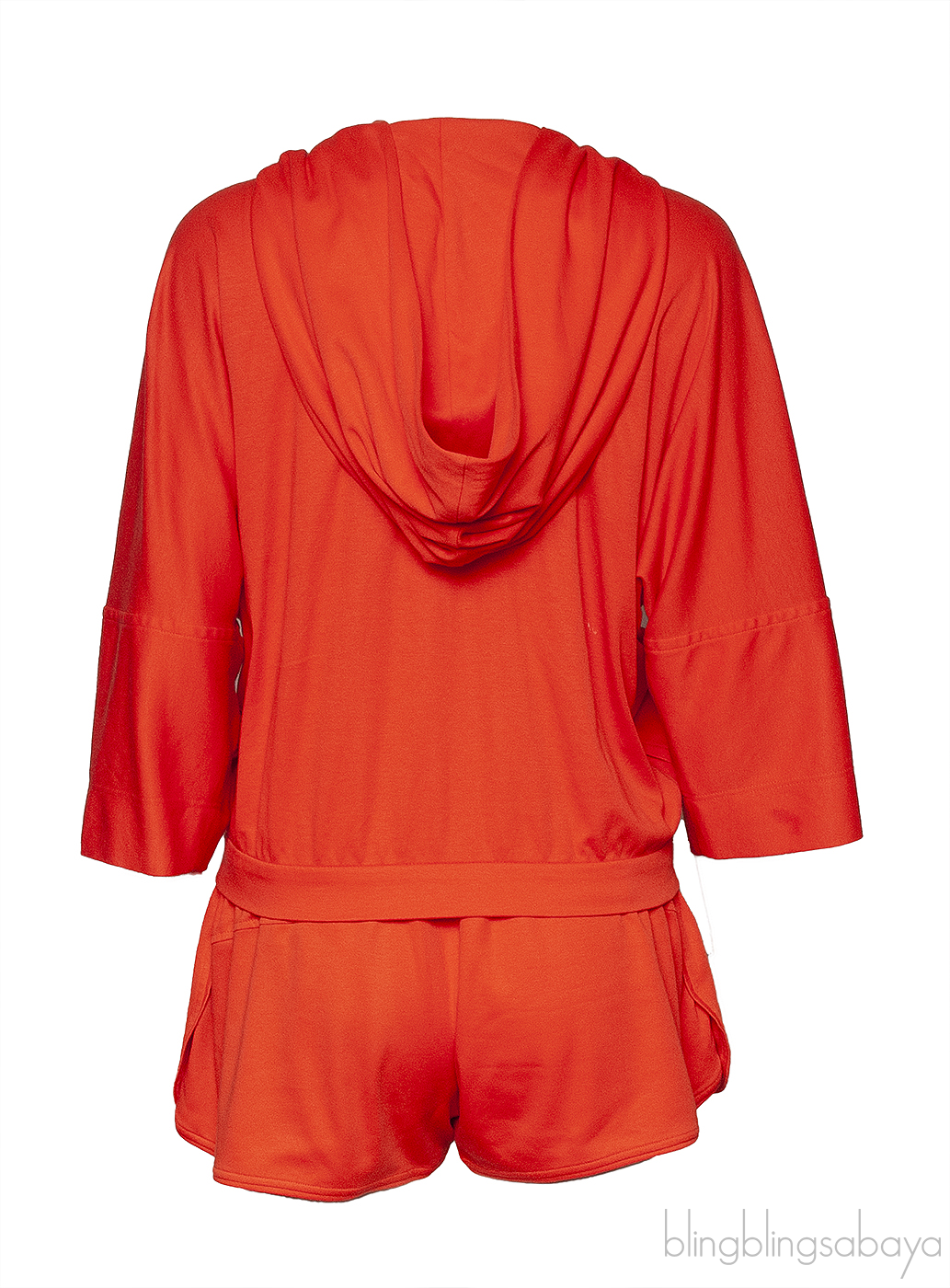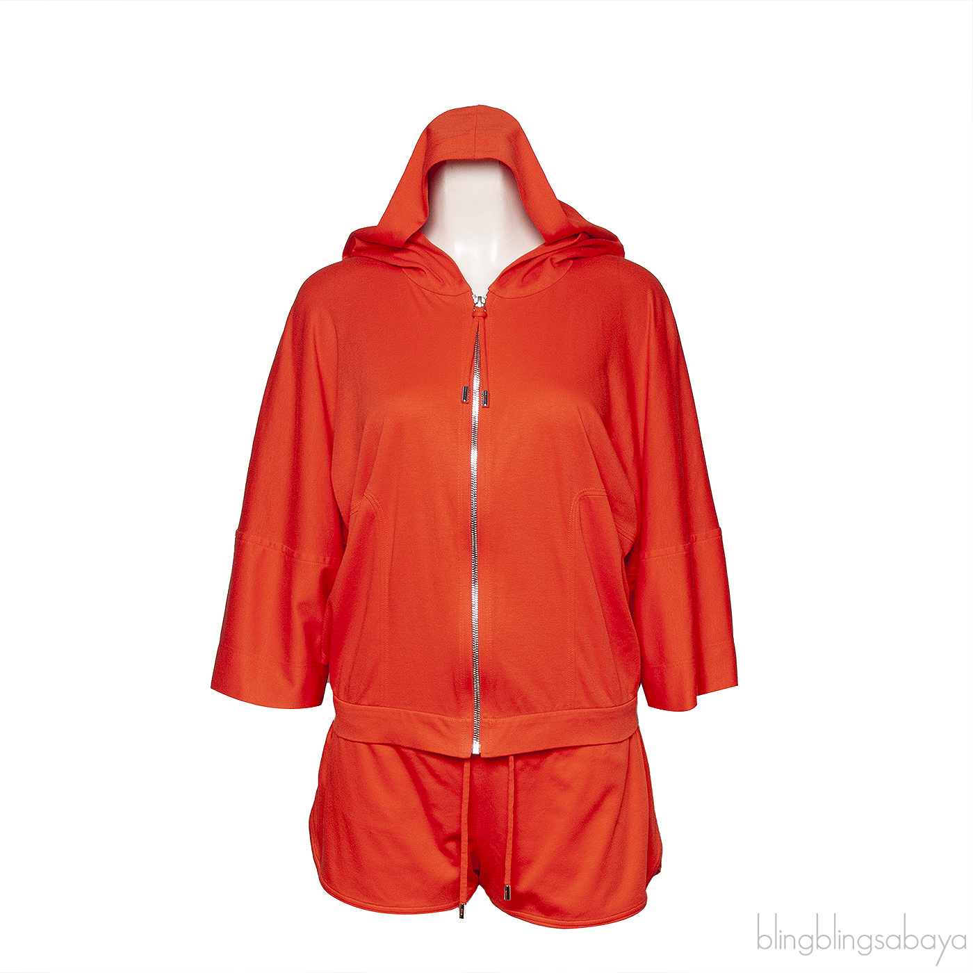 This Hermes Orange Two Piece Tracksuit is crafted from 100% Cotton in plain orange hue. Top features a hooded design with zip opening at front, slightly wide sleeves with side pockets. Bottom shorts features an elastic waist line with drawstring fastening.