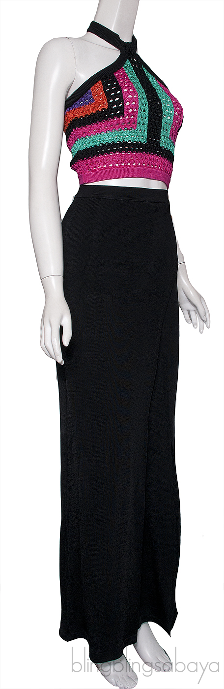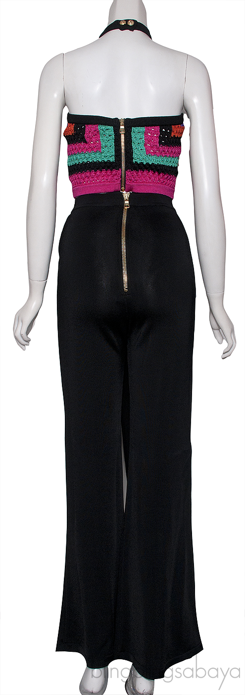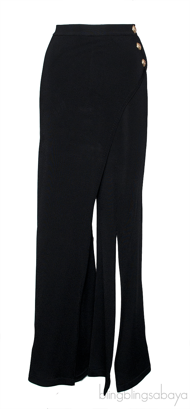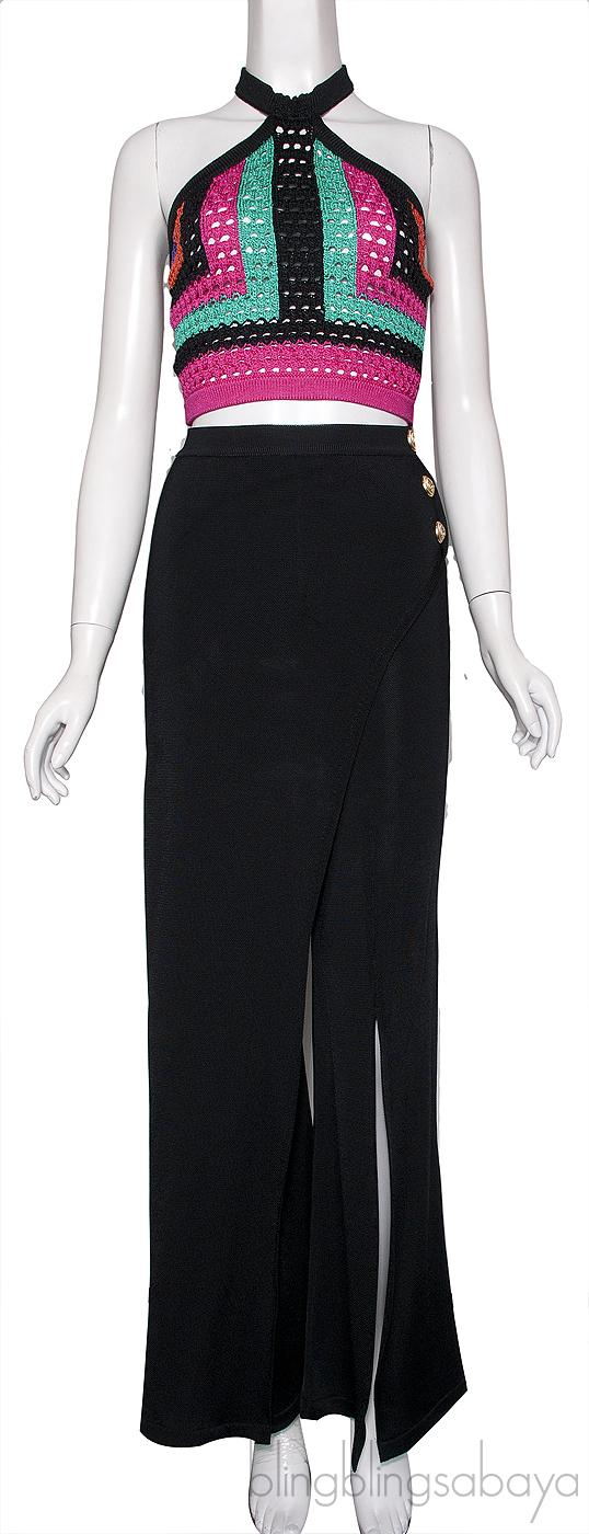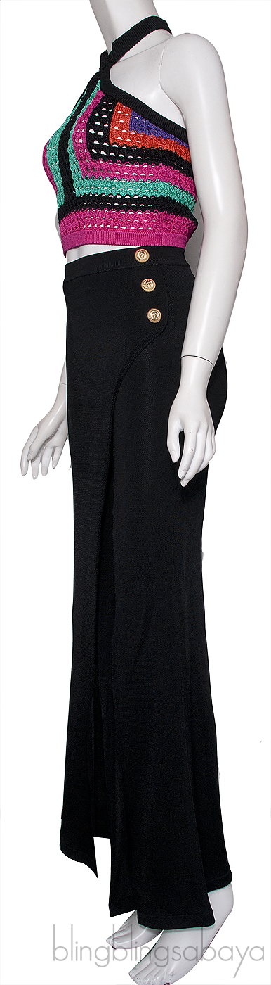 Stunning High-Waisted Flared Pants & Multicolor Crop Top from Balmain. This High-Waisted Flared Pants is crafted from 100% Viscose fabric in black hue featuring a wrap design at front with gold buttons on the side, zip fastening at rear, high-waisted with flared legs with front slit on one leg.