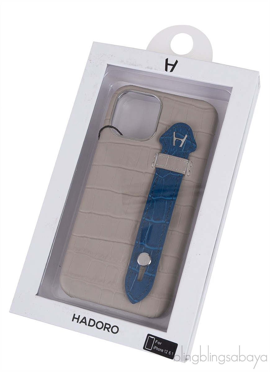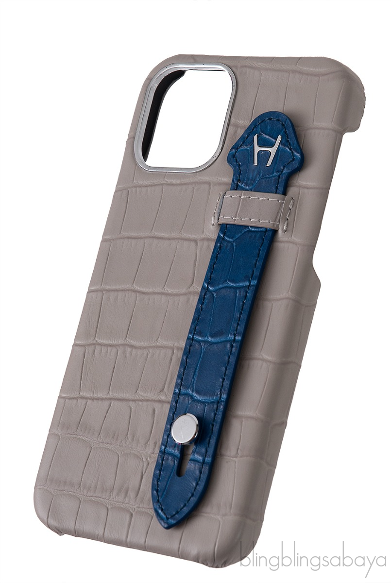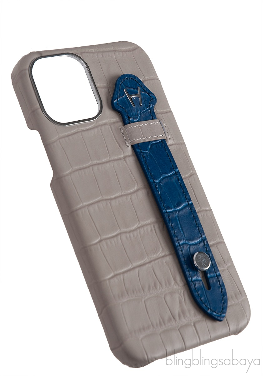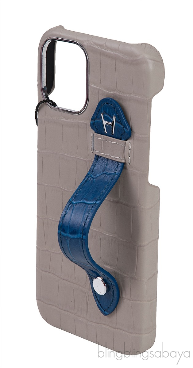 This Iphone 12 Pro Grey and Blue Crocodile Phone Case from Hadoro is luxuriously crafted from a genuine crocodile leather in grey with contrasting blue crocodile handle strap accented with the silver hardware.