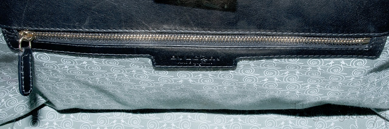 This piece has a single flat leather handle and has interior lined with snail print canvas. It has one side zipped pocket, an open pocket and a cell phone compartment inside..