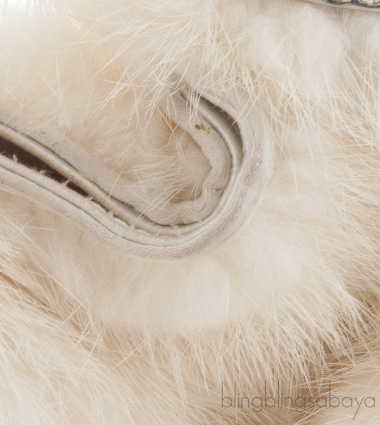 This Ivory Fur Crystal Handbag from Rene Caovillla is crafted in Ivory Fur and Satin fabric featuring a crystal embellished silver top handle. It has the magnetic button closure giving access to an interior fully lined with ivory satin fabric with silver logo2 metal plate, one small slit pocket and zip compartment inside.