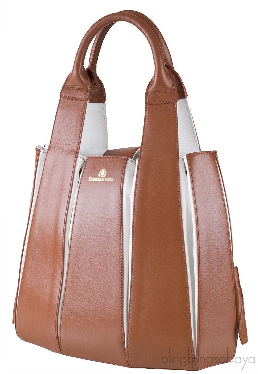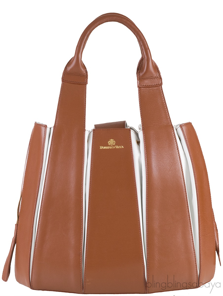 This Julie Bag Leather Bi-color form Domenico Vacca is crafted form brown and white leather accented with the gold hardware. This bag features a strauctured pumpkin design with two top handles, open tap with magnetric strap fastening. It has drawstring fastening on both sides and interior is fully lined with grey suede and has two patch pocket inside.